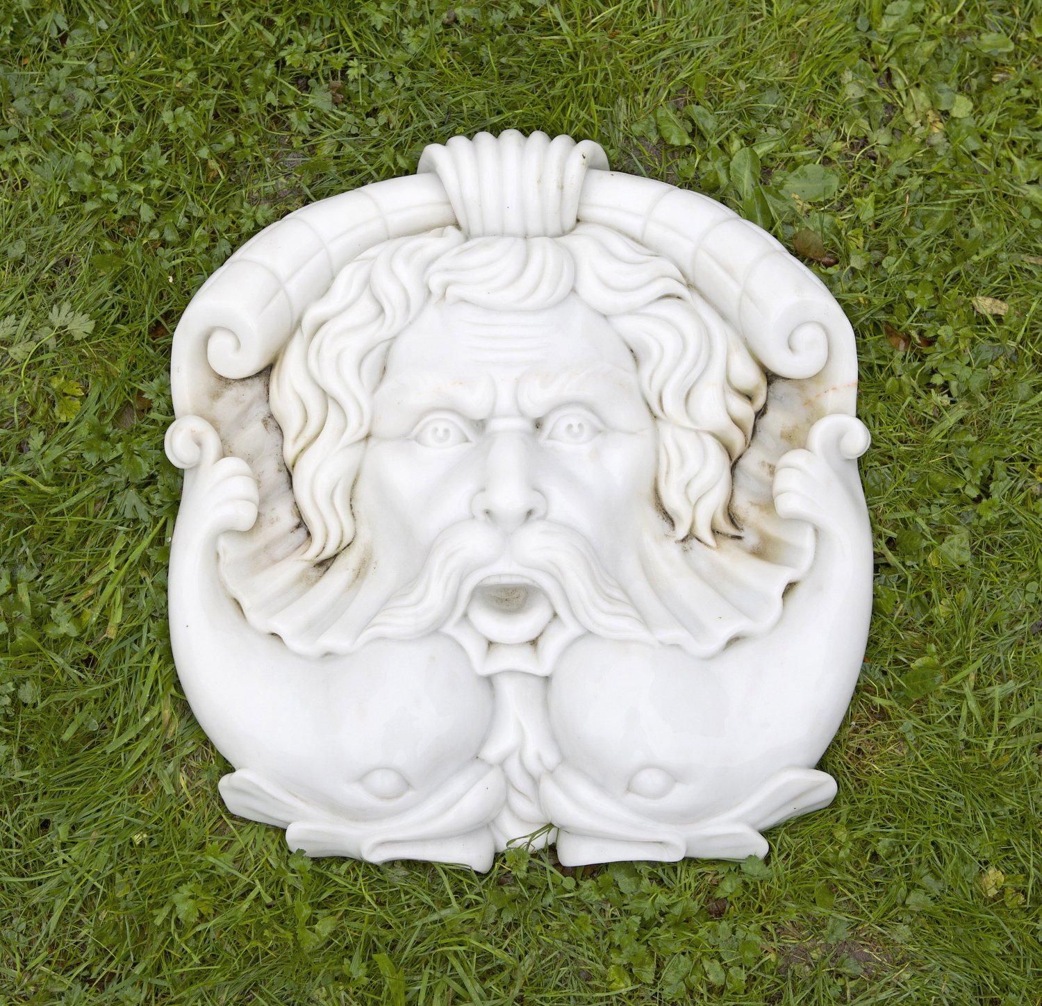 Architekturelement Weißer Marmorguss. Reliefplastisch gestaltetes Maskaron, umgeben von eingerollten Voluten und stilisierten, gegeneinander gestellten Delfinen. 45 cm x 43 cm.