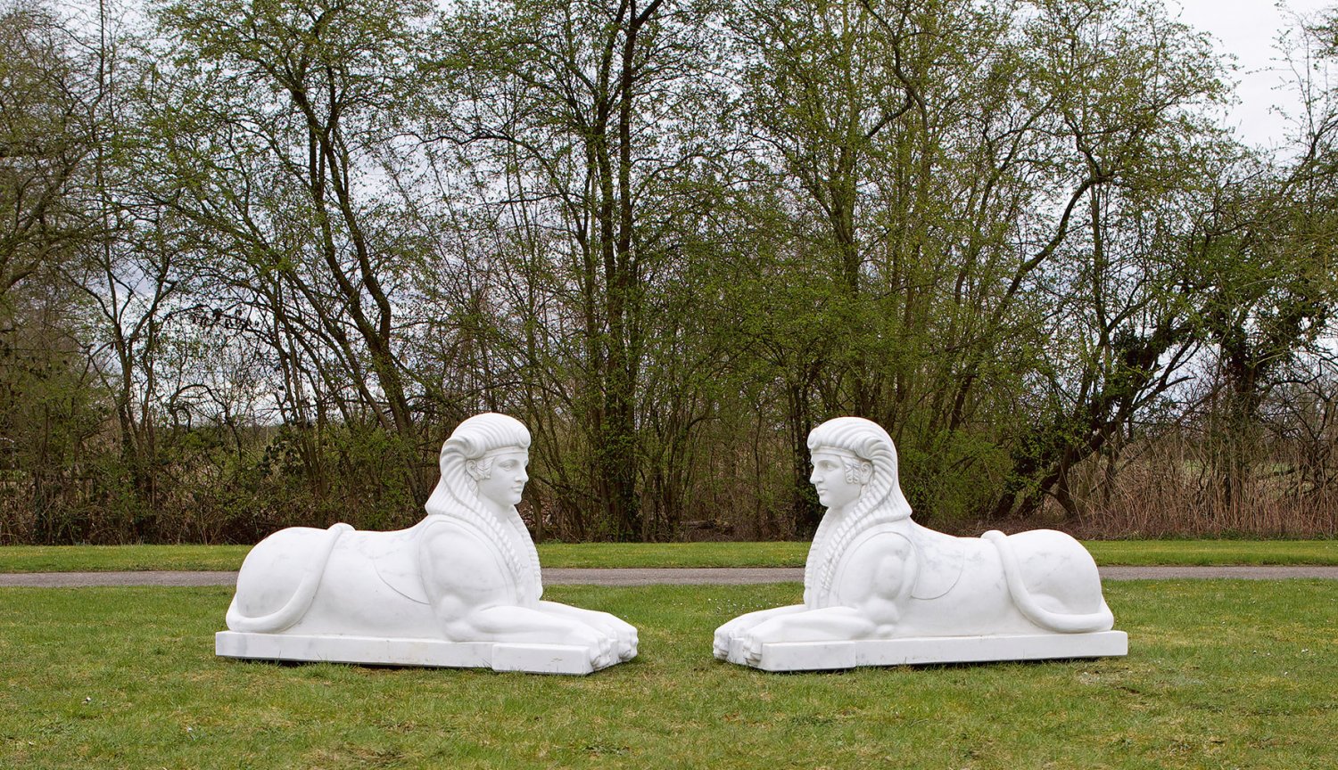 Paar monumental große Sphingen als Parkskulpturen Gegenstücke. Weißer Carrara-Marmor. Repräsentative, neoklassizistische Skulpturen. Auf rechteckigen, vorne abgesetzten Plinthen ruhende, vollplastisch ausgeführte Sphingen mit subtiler Oberflächenbehandlung. Die weiblichen Köpfe mit langen, geflochtenen Zöpfen und Kopfschmuck, die Beine und der Schweif in Löwenform. Ca. 89 cm x 153 cm x 55 cm.