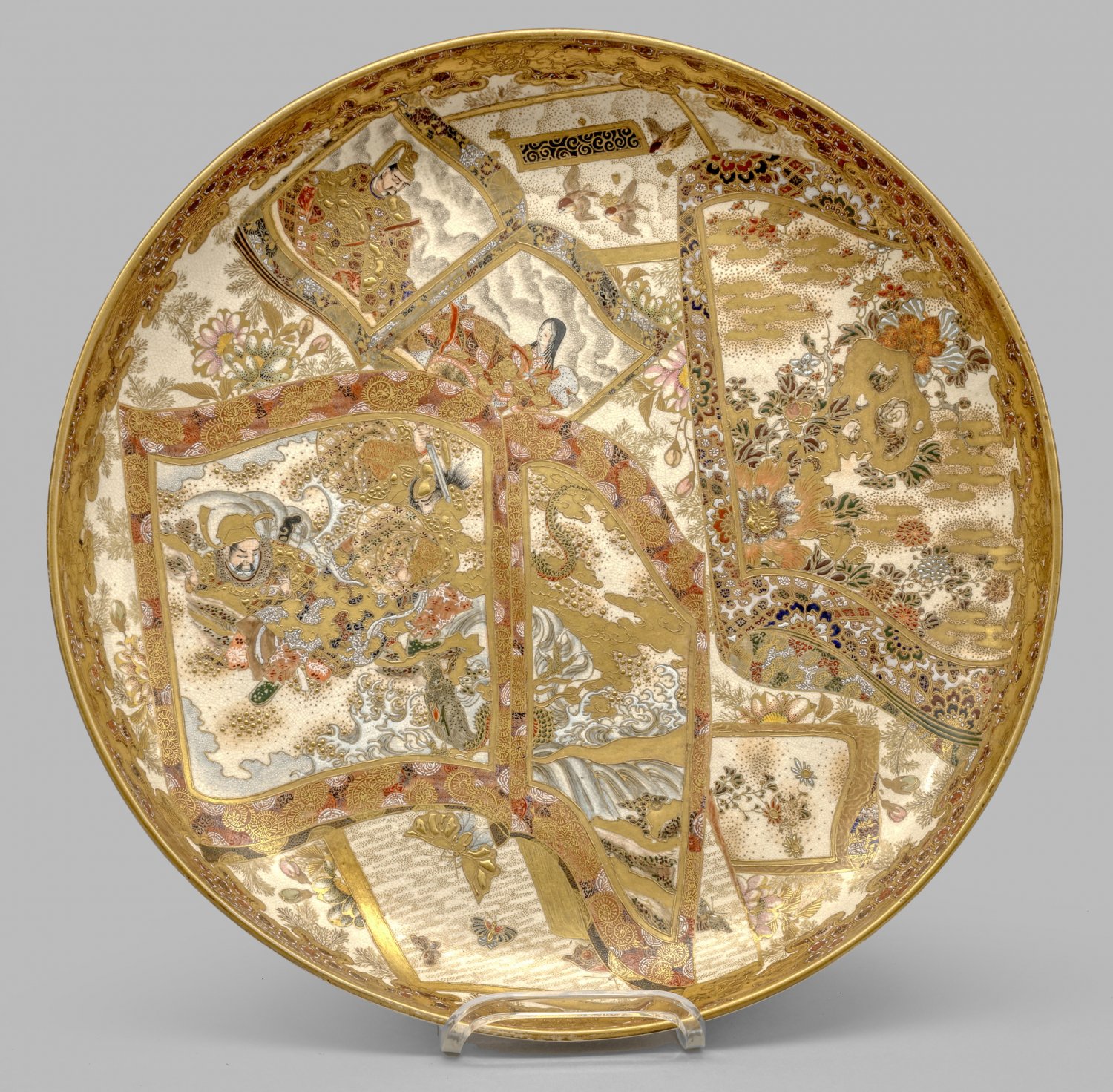 Japanische Satsuma-Schale Steinzeug mit transparenter, fein craquellierter Glasur. Runde, gemuldete Form. Flächendeckender Dekor aus Ornamentreserven mit stilisierten, blühenden Landschaften und Figurenszenen, u.a. von zwei Männern gegen einen Drachen kämpfend. Umlaufende Bordüre aus Brokatmuster und Wolkenmotiven. D. 39 cm.