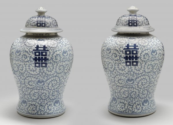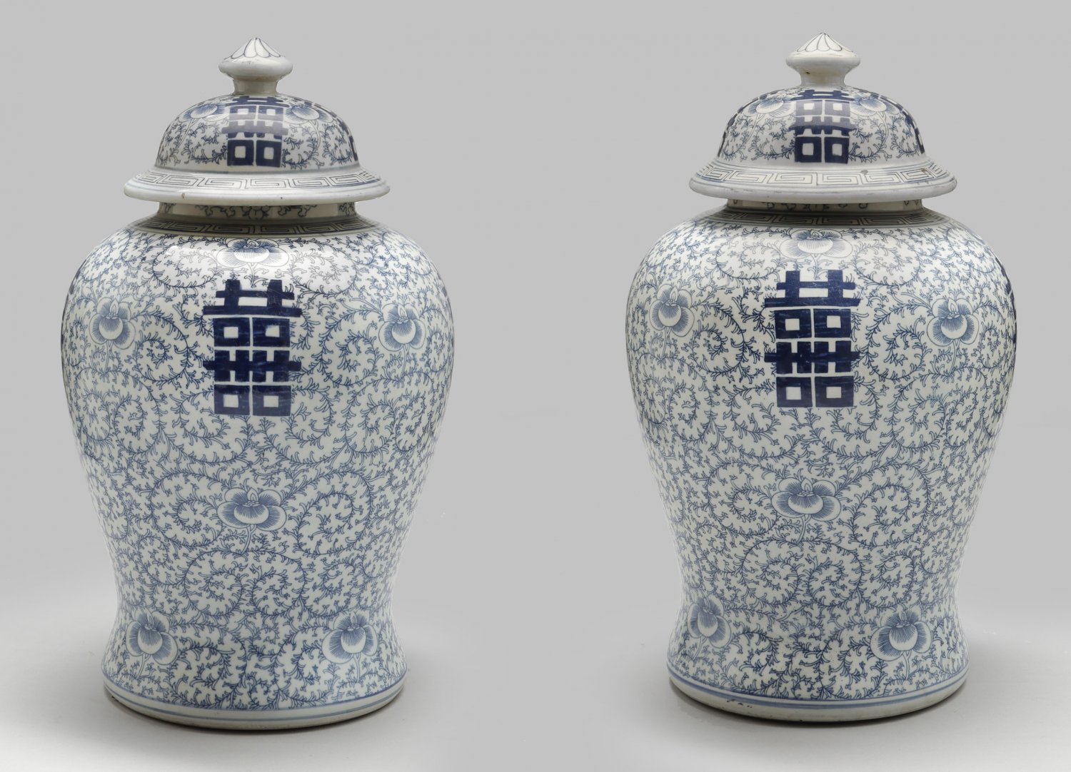 Paar Blauweiß-Deckelvasen Porzellan. Auf der Wandung flächendeckender Dekor aus Rankenwerk mit großen Magnolienblüten und Hsi-Schriftzeichen für "Doppelte Freude" als Symbol für Glück in der Ehe in unterglasurblauer Malerei. Umlaufende Mäanderbordüre. H. 48,5 cm.