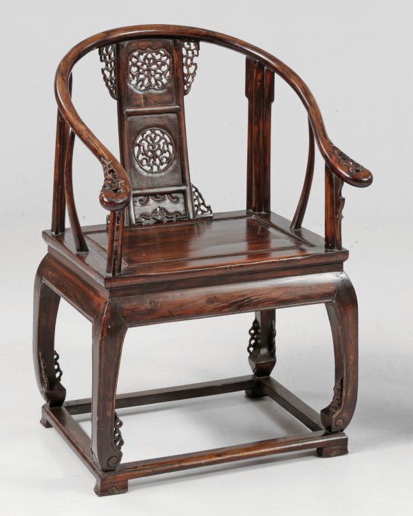 Chinesischer "Horseshoe"-Armlehnsessel Ulmenholz, dunkel gebeizt. Rechteckige, kassettierte Sitzfläche auf bombierter Zarge und geschwungenen Beinen, unterhalb durch gekantete Stege verbunden. Unterschiedliche Stützen für stark gebogte, hufeisenförmige Rückenlehnen mit ornamental durchbrochen gearbeitetem Mittelsteg. H. 98 cm. 69 cm x 70 cm. Sitz-H. 49 cm.