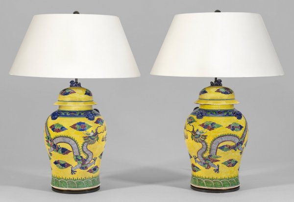 Paar chinesische Deckelvasen als Tischlampen montiert 2-flg.; Steinzeug mit craquellierter Glasur. Balusterförmiger Korpus und aufgewölbter Deckel mit schlankem Schaft als Träger für Leuchtmittel. Auf der Wandung, in kaisergelbem Fond, zwei vierklauige Drachen zwischen Wolken- und Flammenmotiven in polychromer Aufglasurmalerei. Umlaufendes Wellenband und Rankenbordüre. Konischer Lampenschirm. Elektrifiziert. Vasen-H. 50 cm. Ges.-H. 80 cm.
