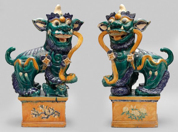 Paar monumentale Sancai-Fo-Hunde als Tempelwächter. Steinzeug, dreifarbig glasiert. Auf profiliertem Rechtecksockel sitzender, weiblicher Fo-Hund mit Jungem bzw. männliches Pendant mit gedrücktem Ball. Sockel mit reliefierten Päonien- und Kirschblütenzweigen. Minim. besch.; H. 92 cm.