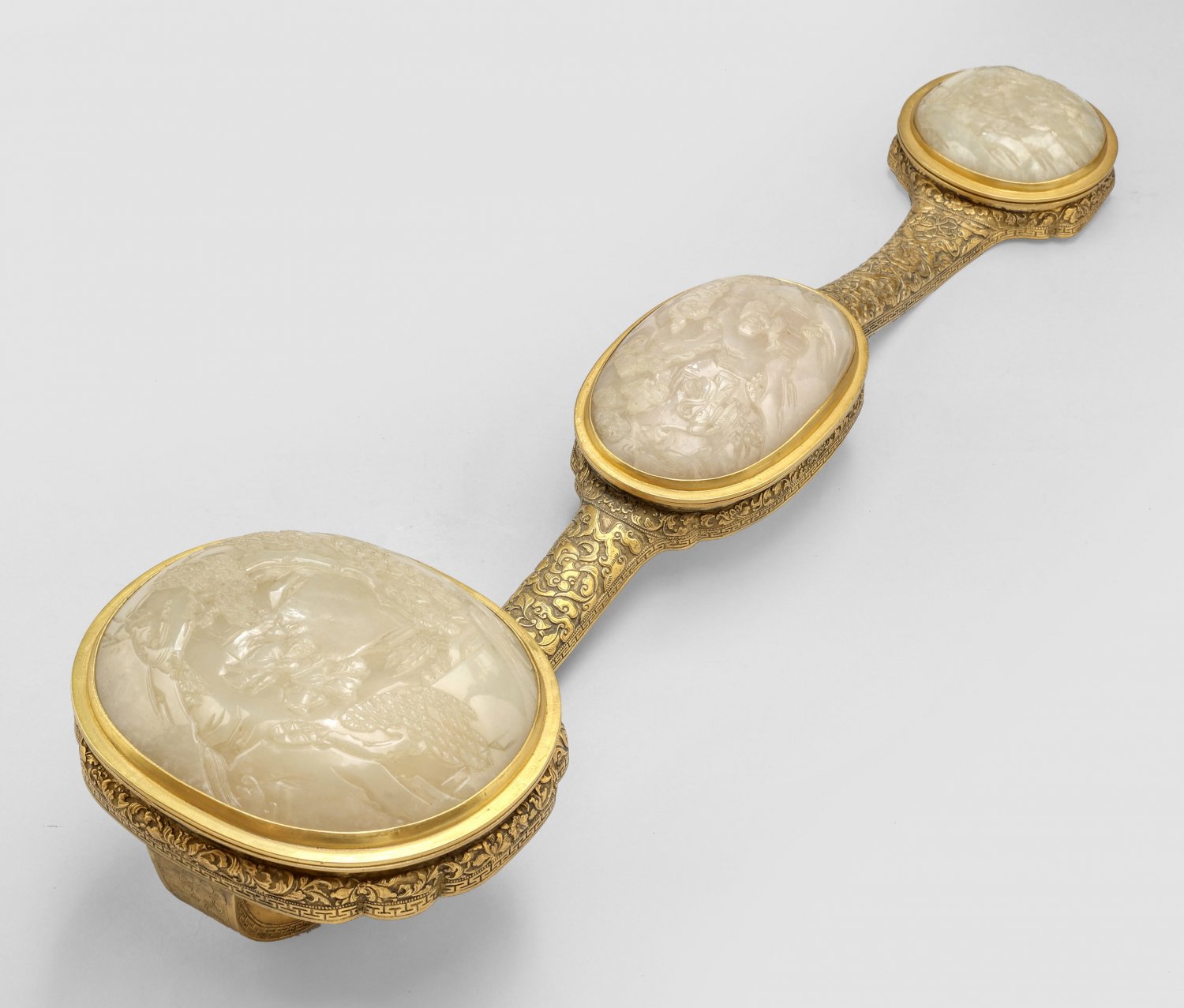 Prächtiges großes Ruyi-Zepter mit Jademedaillons Bronze, vergoldet sowie helle, gewölkte Nephrit-Jade. S-förmig geschweifter Schaft mit querovalem, passigem Kopf. Allseitig äußerst reicher, gravierter und ziselierter Dekor aus großen Lotusblüten, Fischdrachen, verschiedenen mystischen und buddhistischen Symbolen zwischen arabeskem Rankenwerk und Wolkenmotiven. Umlaufend reliefierte Mäanderbordüre. Schauseitig drei eingelegte, fein geschnitzte Jademedaillons mit verschiedenen, szenischen Darstellungen von Gelehrten bzw. den sog. "Acht Daoistischen Unsterblichen" in stilisierter Landschaft aus Pinienbäumen. L. 58 cm.