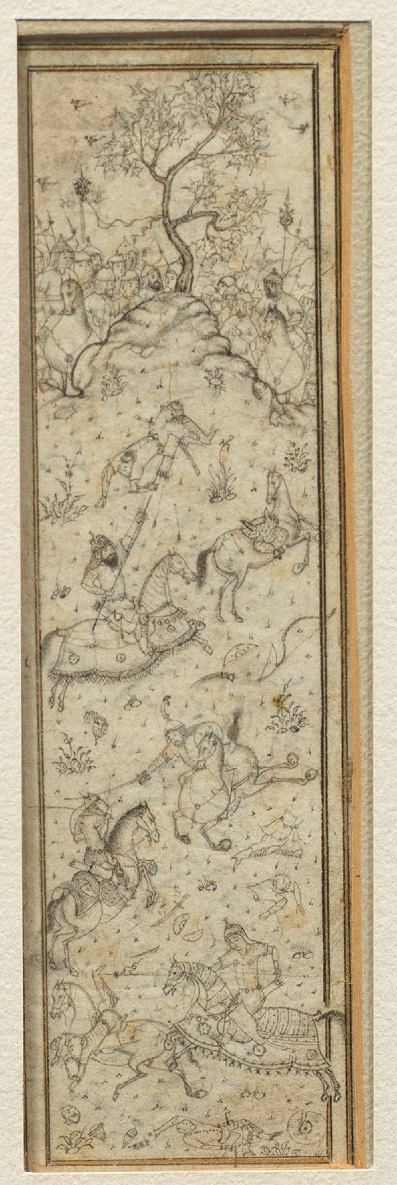 A Persian miniature ink drawing depicting a battle scene. On the reverse calligraphy.