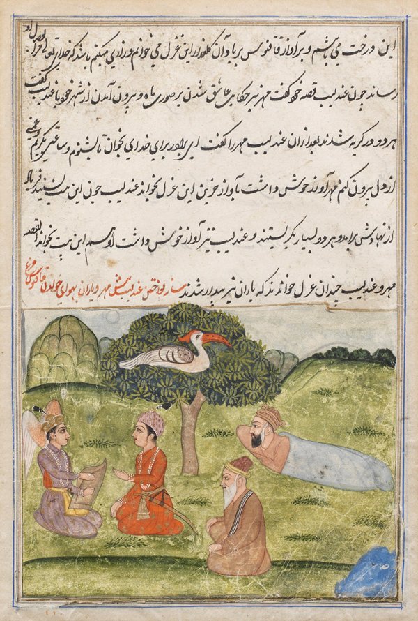 Persische Manuskriptseite Gouachemalerei und Tinte auf Pergament in filigraner Naskhi-Kalligraphie. Seite zweigeteilt in Text und szenische Darstellung einer Landschaft mit Ibis und vier sitzenden Männern im Gespräch. 26,5 cm x 18 cm (Passepartoutausschnitt). Rahmen.