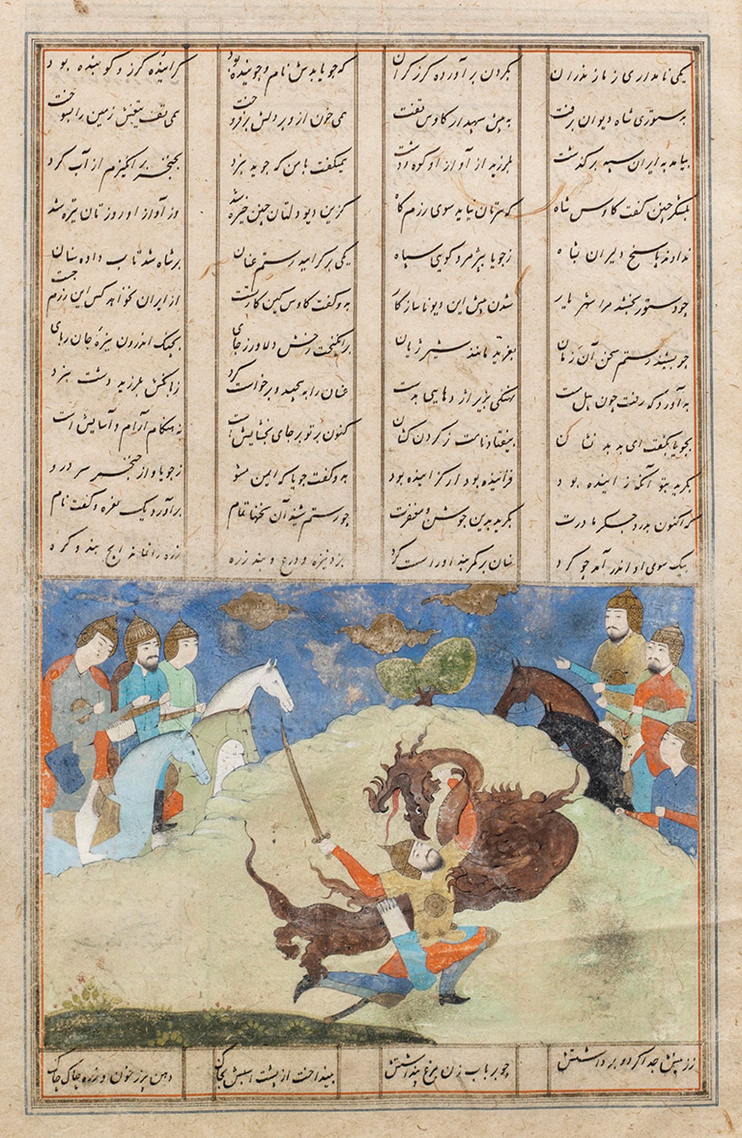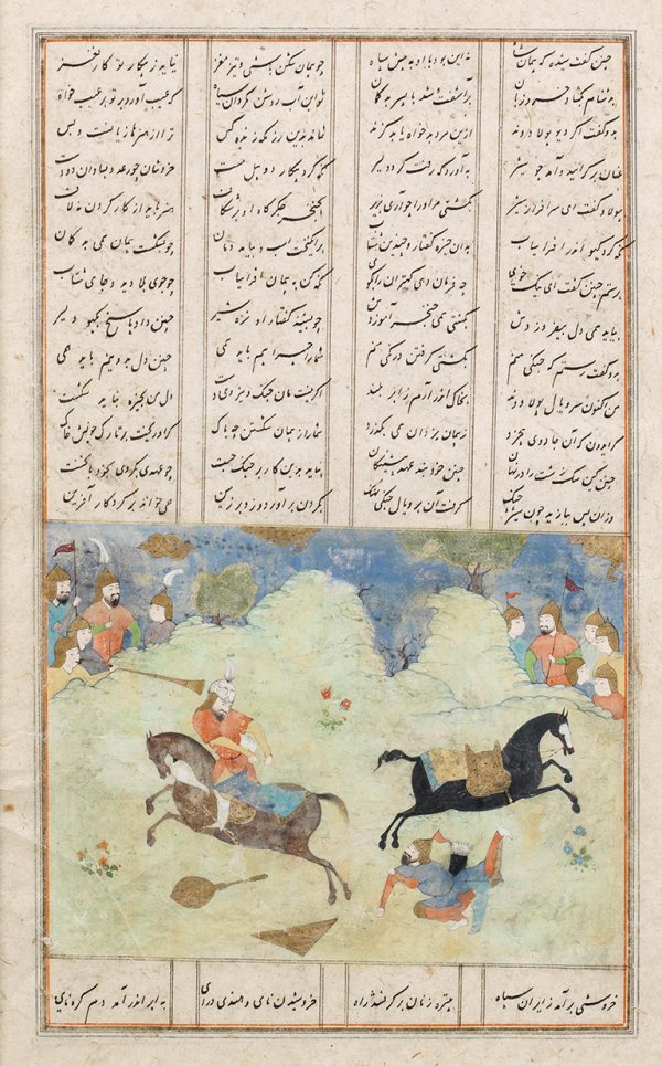 Paar Persische Manuskriptseiten Aquarellmalerei und Tinte auf Bütten in filigraner Naskhi-Kalligraphie. Seite zweigeteilt in Text und szenische Darstellung einer Landschaft jeweils mit Reiterturnier und einem Drachenkampf. Jeweils 28 cm x 18 cm (Passepartoutausschnitt). Rahmen.
