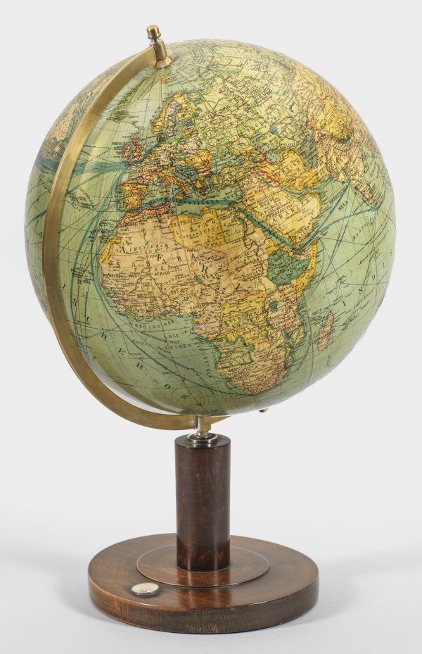 Tischglobus Dunkelbraun gefasstes Holzgestell auf gefußter, flacher Sockelplatte. Drehbare, aus 12 lithographierten Segmenten und zwei Polkappen bestehende Erdkugel mit Ozeanen und Strömung. Achse und Halbkreis-Meridian aus graviertem Messing. Sockel mit kleinem eingelassenem Kompass. Bez. Columbus-Erdglobus. Wirtschaftspolitische Ausgabe, Bearb. Dipl.-HDL. W. Bockisch, politisches Kartenbild Dr. R. Neuse u. C. Luther. Mit Herstellerzeichen. H. 53 cm.