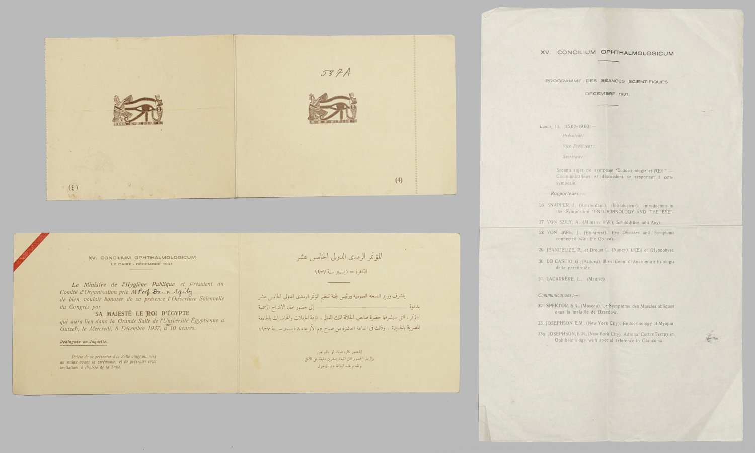 Einladung für Prof. Dr. Aurel von Szily (1880 - 1945) zur Eröffnungsfeier des 15. Ophthalmologischen Kongresses im Dezember 1937 in Kairo in Anwesenheit des Ägyptischen Königs Faruq (1920 - 1965)