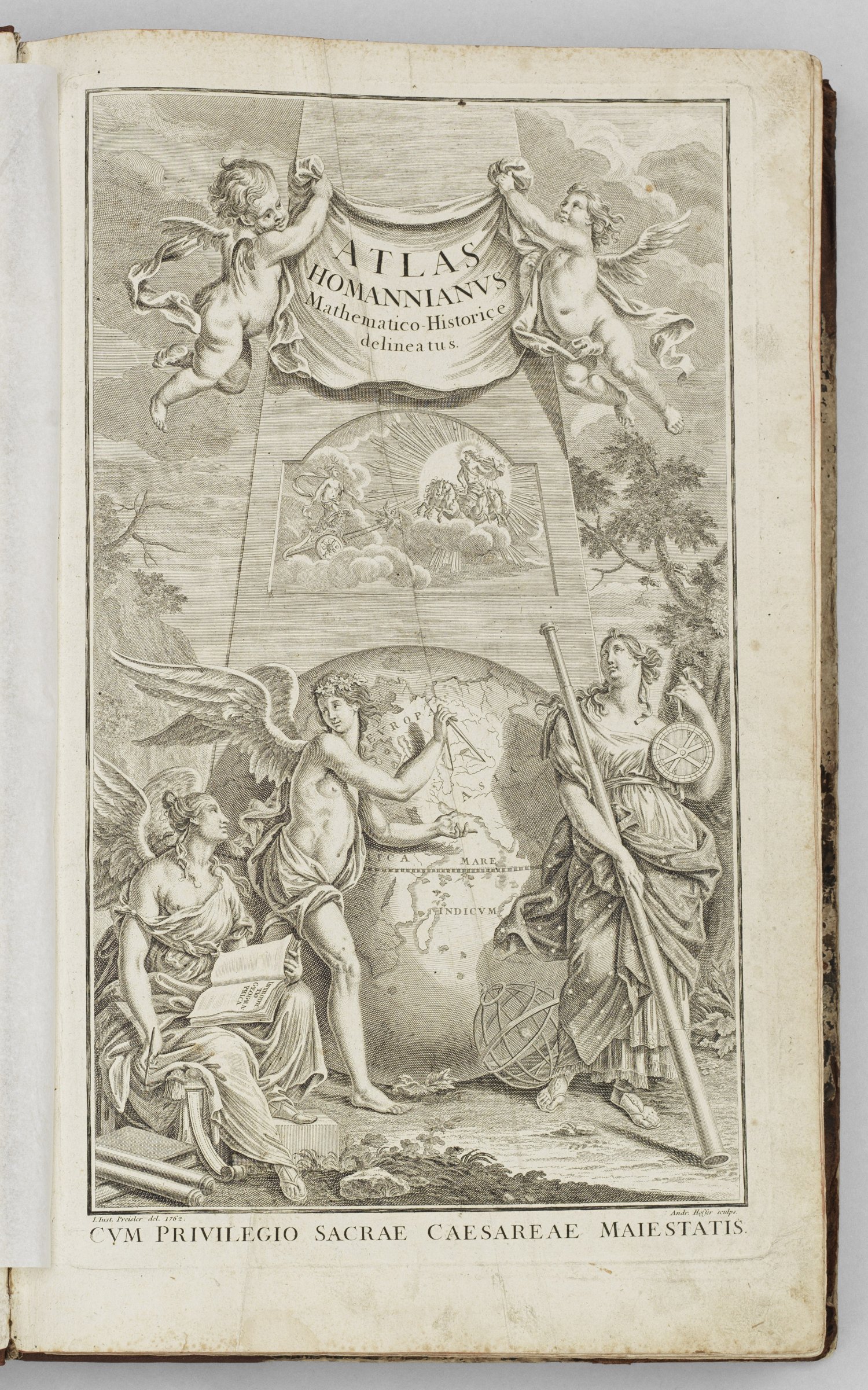 Historisch bedeutender Weltatlas mit ca. 100 doppelblattgroßen Kupferstichtafeln, teilw. altkoloriert. U. a. Tafeln mit den Sternenbildern, dem Planetensystem, Weltkarten sowie detailreiche Landkarten. Handschriftlich nummeriert. Zwei teilw. sign. Titelkupfer. Hrsg. Homann Erben in Nürnberg um 1762. Ledereinband mit goldgeprägtem Rücken, roter Buchschnitt. Altersgemäße Gebrauchsspuren, teilw. rest.; Nicht kollationiert. 55,5 cm x 35,5 cm.
