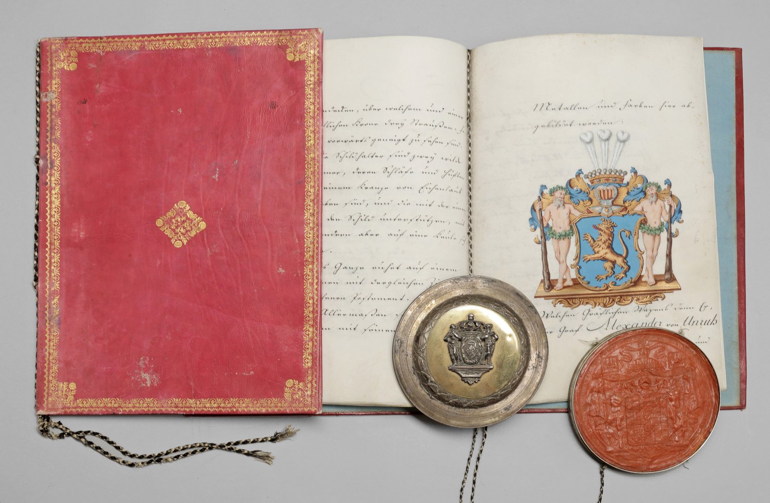 Mehrseitige, auf Pergament geschriebene Verleihungsurkunde mit eigenhändiger Unterschrift Friedrich Wilhelm III., dat. Berlin, 06.02.1797, roter Maroquineinband mit Goldprägung; mehrseitiges, auf Pergament geschriebenes Grafendiplom mit Wappen in Gouache- und Goldmalerei sowie eigenhändiger Unterschrift Friedrich Wilhelm III., dat. Berlin, 10.01.1802, roter Maroquoneinband mit Goldprägung. Zum Grafendiplom gehörige, runde Berliner Siegeldose König Friedrich Wilhelm III. (1770 - 1840) aus teilvergoldetem Silber. Auf dem Deckel ein gegossenes Relief mit dem von Wilden Männern flankierten Königsmonogramm unter der preußischen Königskrone. Im Innern ein Wachssiegel mit dem Großen Preußischen Staatswappen. Gest. Tremolierstrich, Berliner Stadtmarke, Jahresbuchstabe G (1788-1802), Meister Christian Gottlieb Pintsch (Vgl. Scheffler, Berlin, Nr. 11, Nr. 1072). Ca. 35 cm x 25,5 cm. Dose D. 14 cm.