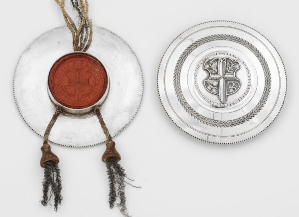 Siegelkapsel Silber. Siegelwachs. Flache Dose/ Kapsel mit reliefiertem Schildwappen der Stadt Freiburg i. Breisgau, nach einer mittelalterlichen Münzvorlage gearbeitet. Innen ähnliches rotes Wachssiegel, umlaufend beschriftet mit "Friburgensis Magistratus". Gest. 13 Lot, Meister Reich. Gew. ca. 278 g. D. 10,6 cm.