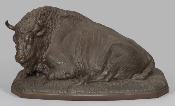 "Wisentkuh Sonja". Originaltitel Böttgersteinzeug. Auf gekantetem, naturalistisch reliefiertem Grassockel liegende Wisentkuh mit nach links gewandtem Kopf. Entw. Erich Oehme, 1937. Modell-Nr. 86147. Künstler-Bez. mit Dat. 1937. Schwertermarke. H. 21 cm. L. 40 cm.
