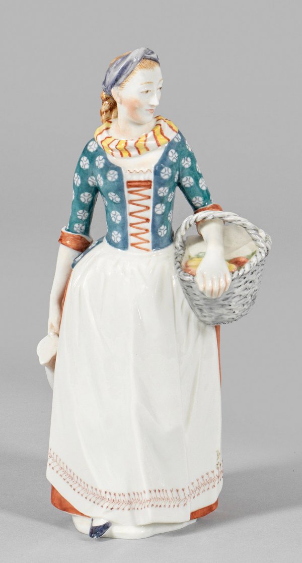 A porcelain figure of a female cook with basket. Manufacturer's mark.