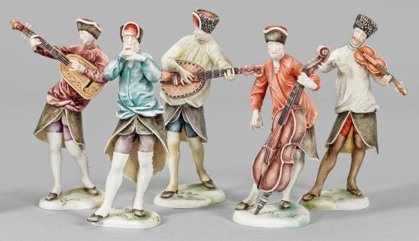 Fünf Musikerfiguren aus der "Böhmischen bergmännischen Musikkapelle." Violin-, Baß-, Klarinetten-, Lauten- und Gitarrespieler, auf flacher Plinthe stehend. Polychrome Malerei. Modell-Nr. 333-337. Entw. Theodor Kärner, 1906-11 nach Holz-Elfenbeinfiguren Simon Trogers (1683-1768). Manufakturmarke. H. 21 cm - 22 cm.