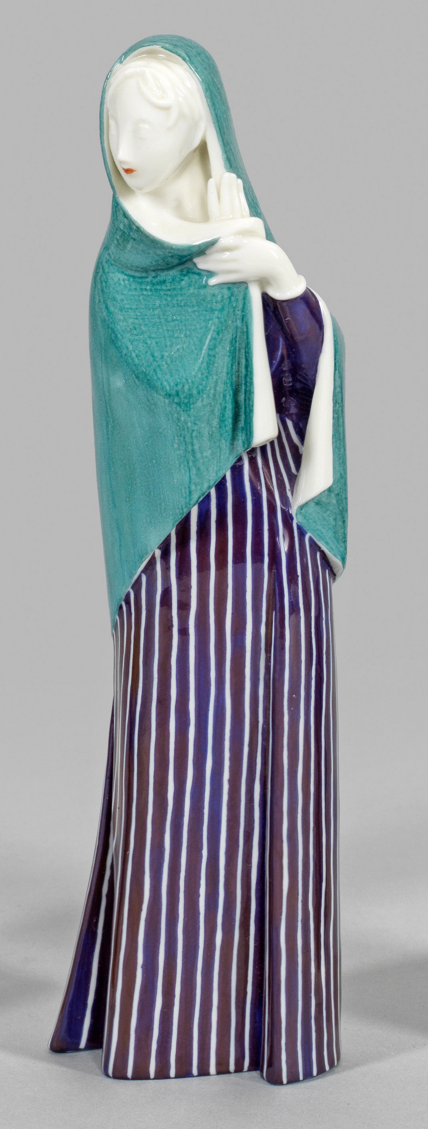 Mädchen mit Umhang als Allegorie des Winters aus der Serie der "Jahreszeiten". Polychrome Malerei. Modell-Nr. 983. Entw. Johanna Künzli, 1957. Maler-Monogr.; Manufakturmarke. H. 22 cm.