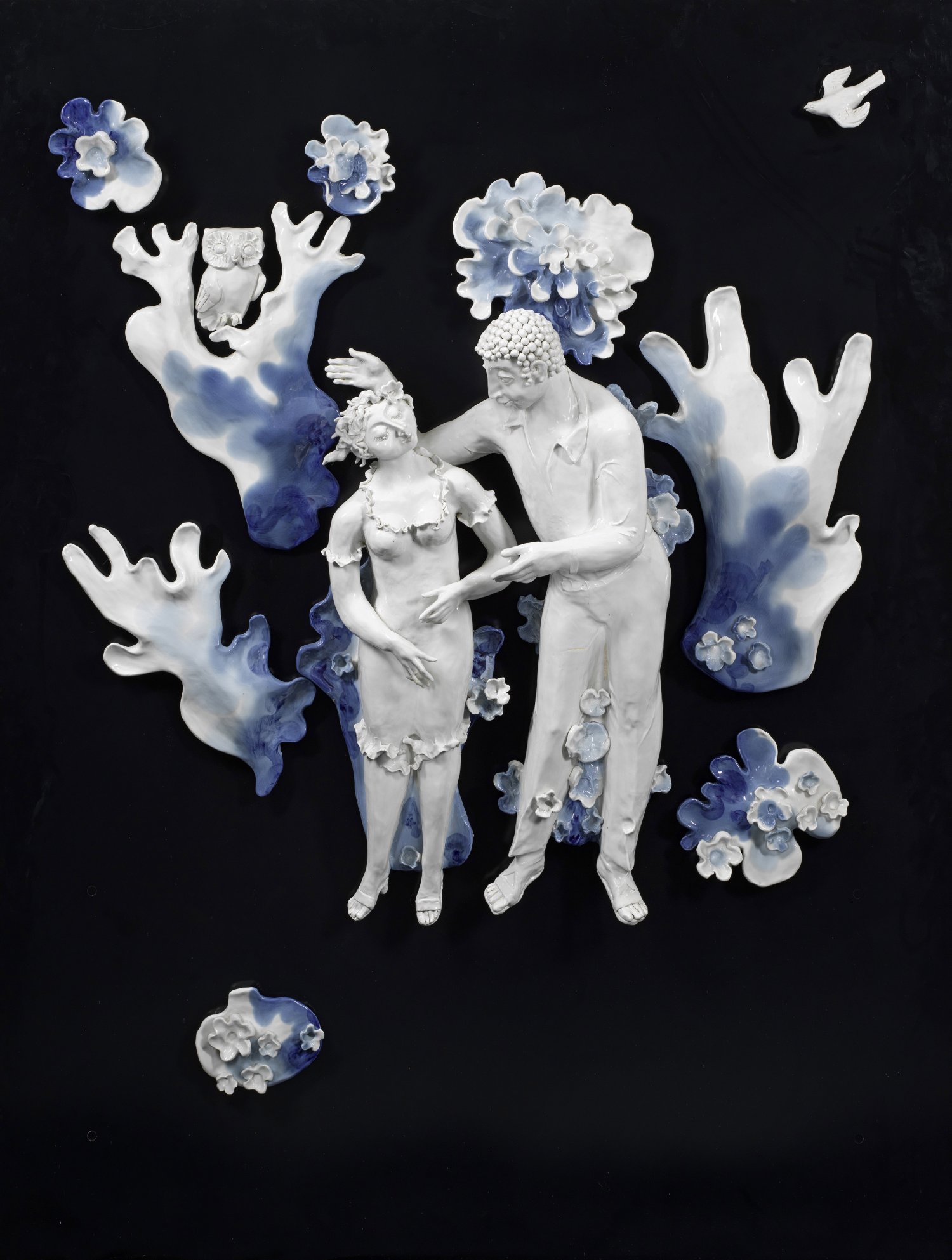 Auf rechteckiger, schwarz lackierter MDF-Holzplatte installierte Wanddekoration in Porzellan aus vollplastisch gearbeiteten Figuren und handmodellierten, vegetabilen und floralen Formelementen. Szenische Darstellung eines jungen Paares in sommerlicher Kleidung beim Spaziergang inmitten einer großflächig angelegten, von stilisierten Bäumen, Laub- und Blumenwerk dicht komponierten Landschaftskulisse mit heranfliegendem Vogel sowie im Baum sitzender Eule. Entw. und Ausführung Peter Strang mit Staffierung in Lösungs- und Unterglasurfarben von Prof. Heinz Werner, 1976. Teilw. unw. produktionsbedingte Brand- und Haarrisse. Unw. rep.; Schwertermarke. Plattenmaß 180 cm x 140 cm.