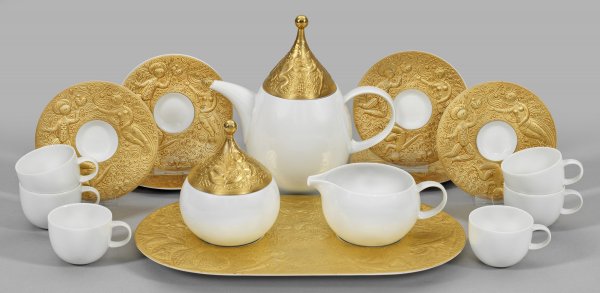 Espressoservice "Die Zauberflöte" von Björn Wiinblad für sechs Personen. 10-tlg.; Mokkakanne, Sahnegießer, Zuckerdose, 6 Tassen mit Untertassen, Tablett. Reliefierter Dekor "Sarastro" mit Mattvergoldung. Manufakturmarke. Kannen-H. 19 cm.