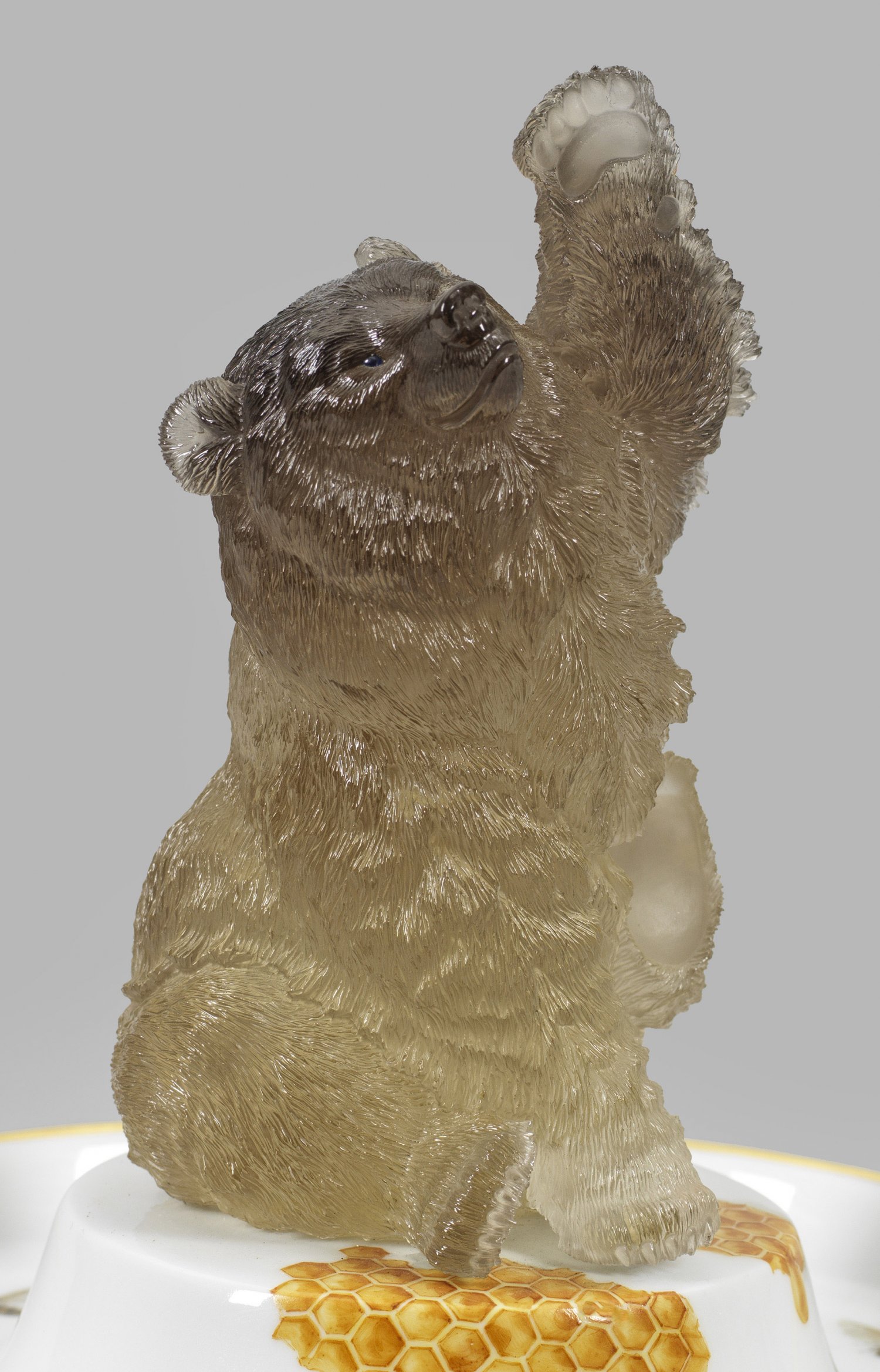 Charmant komponierte Darstellung eines Bären als Honigliebhaber auf einem Porzellan-Tafelaufsatz, entstanden als Kooperationsarbeit zwischen dem "Juwelier Friedrich" in Frankfurt a. M., dem ehemaligen Meissner Porzellanmaler Andreas Knobl und der Höchster Porzellanmanufaktur. Das international bekannte, 1947 von Karl Friedrich gegründete Juwelieratelier avancierte mit ihren Haute Joaillerie-Meisterwerken zur absoluten Luxusmarke mit internationaler Kundschaft. Mehrmals wurden die exklusiven Schmuckarbeiten mit dem "Diamonds International Award" in New York, der weltweit angesehensten Auszeichnung für Schmuckdesigns, gewürdigt. Andreas Knobl gründete 1991 ein Atelier für Porzellanmalerei in Lenggries sowie eine eigene Designlinie. Er führte Entwürfe für bekannte Porzellanmanufakturen aus, u. a. Nymphenburg, Rosenthal und Höchst. Mit Juwelier Friedrich verbindet ihn eine langjährige Zusammenarbeit.