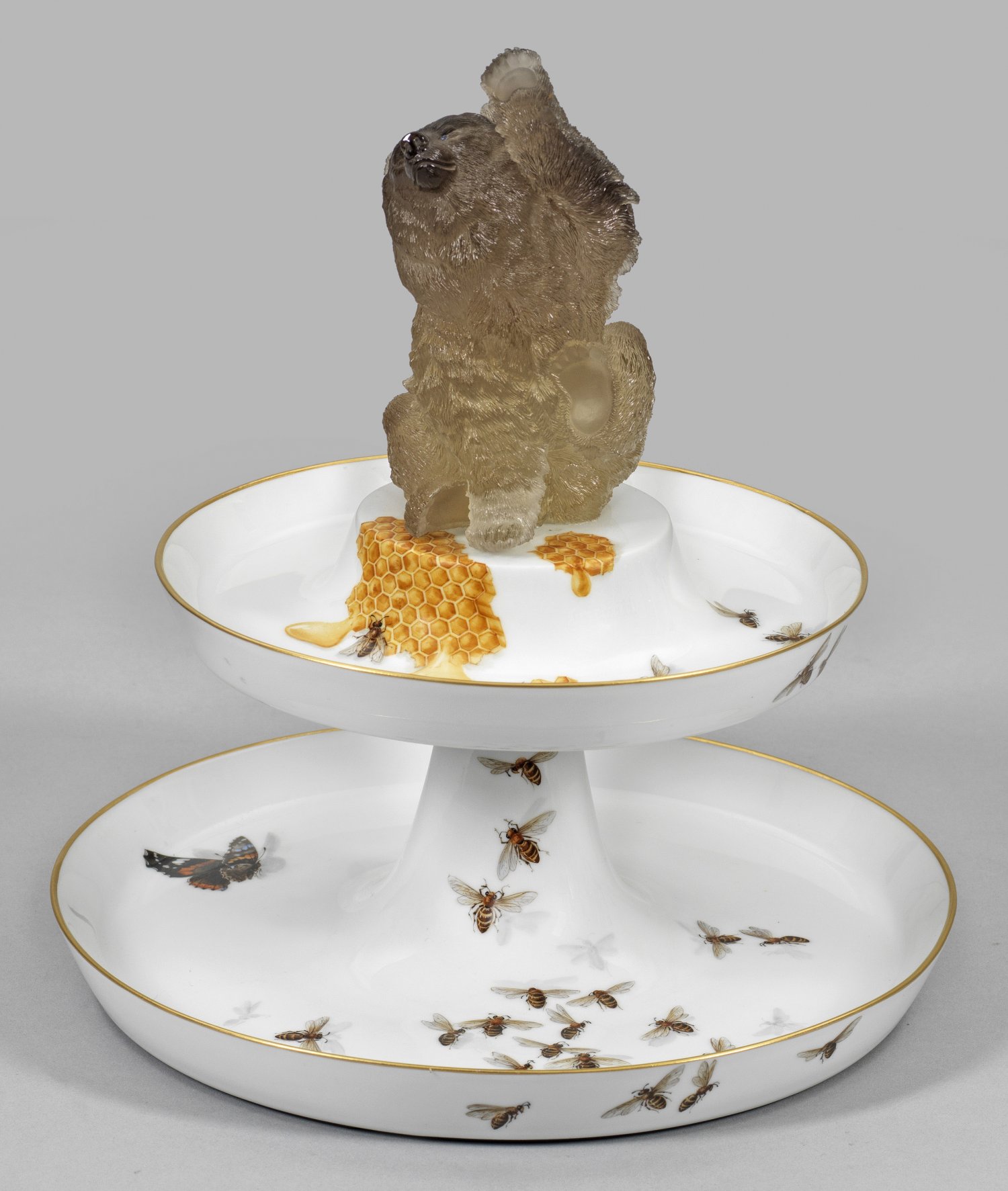 Zweistöckige Etagere aus flach gemuldeten Porzellanschalen mit konisch ansteigendem Rand. Als Bekrönung die äußerst detailreich gearbeitete, vollplastische Figur eines sitzenden Bären mit erhobener, linker Tatze, handgefertigt aus geschnittenem und graviertem Rauchtopas mit feinem Farbverlauf. Die Augen in Form von mandelförmigen Saphir-Cabochons. Im Spiegel ombrierte Darstellung eines farbenprächtigen Schmetterlings sowie Bienen, zu einer Bienenwabe fliegend, aus der Honig tropft. Polychrome Malerei. Goldrand. Oberhalb bez. "Friedrich". Im Boden Maler-Sign. "Knobl". Manufakturmarke mit Wappen. H. 28 cm. D. 20 cm - 26 cm.