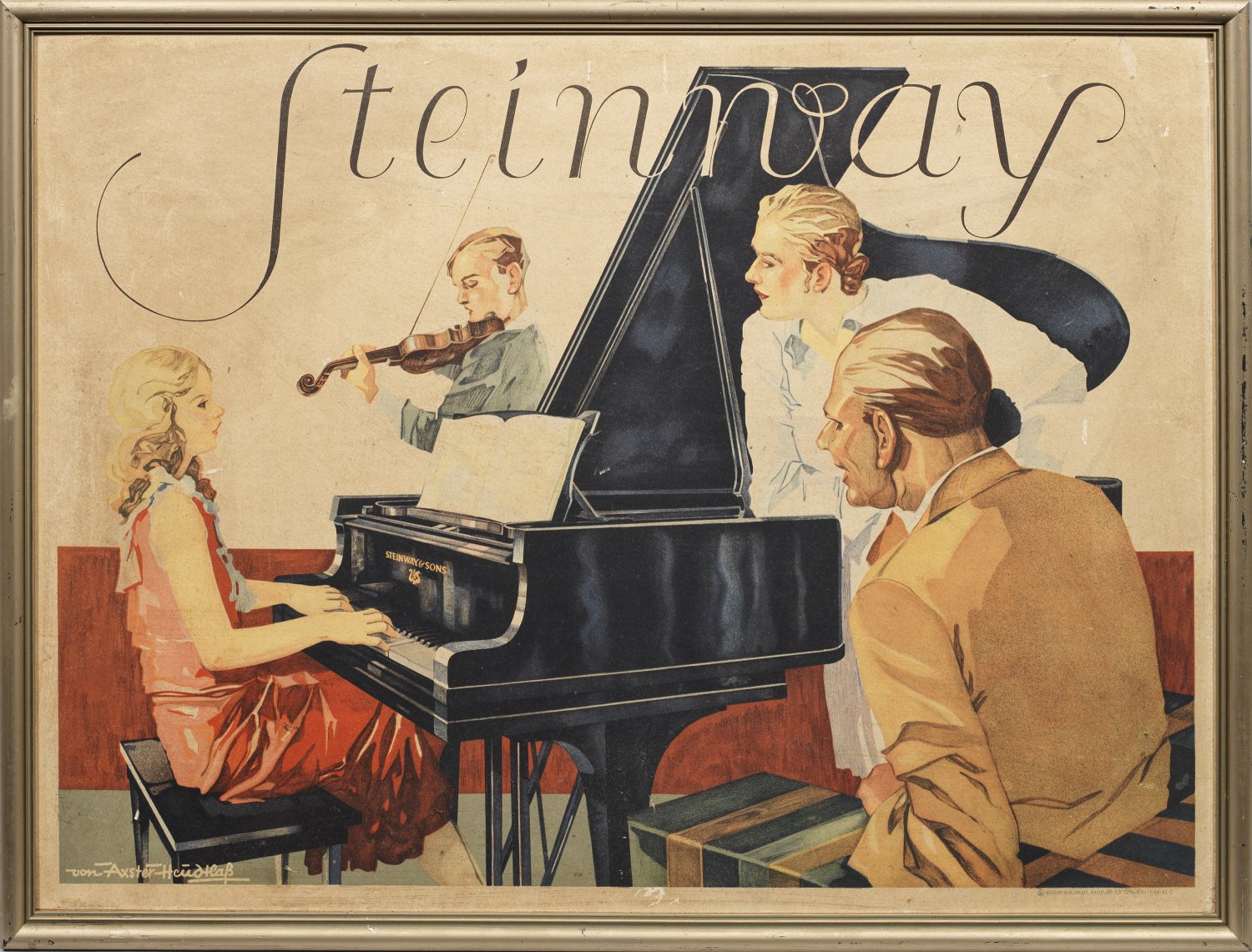 Farblithographie/Papier, original auf Karton kaschiert, um 1930-1940. Im Stein sign.; Druck Gustav A. Schmidt, Hamburg. Dekoratives Plakat mit Geschwisterduo, Steinway-Flügel und begeisterten elterlichen Zuhörern. Das Künstlerpaar gründete um 1925 ein gemeinsames Atelier für Gebrauchs- und Werbegrafik, arbeitete im Auftrag renommierter Unternehmen wie Lufthansa und Steinway & Sons. Gebräunt, ger. Läsuren. 60,5 cm x 82,5 cm. Original-Rahmen