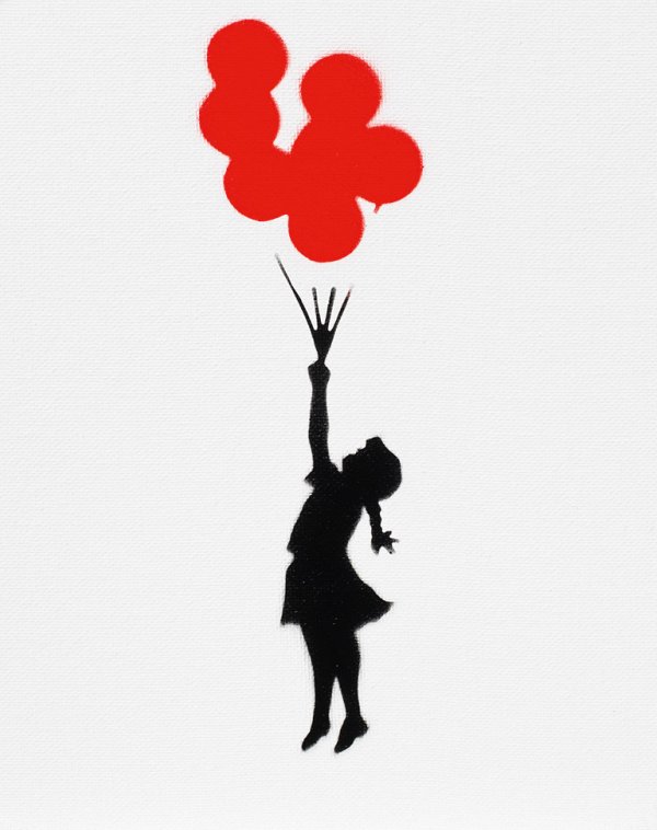 Pochoir (Schablonengraffiti)/Leinwandkarton, 2015. Souvenir der Kunstaktion Dismaland, die der Streetart-Künstler Banksy 2015 in Weston-super-Mare in England durchführte. In einer ehemaligen Badeanstalt errichtete er einen Vergnügungspark, der ausdrücklich nicht für Kinder geeignet war. Unter dem Namen "Dismaland" (deutsch Trostlosland) entwarf er ein Gegenprogramm zu Disneyland. Die Aktion war auf 36 Tage begrenzt, während derer eine Reihe verschiedener Souvenir-Multiples verkauft wurden. Verso mit Etikett "Dismaland. Bemusement Park / A Banksy Event". 25 cm x 20 cm.