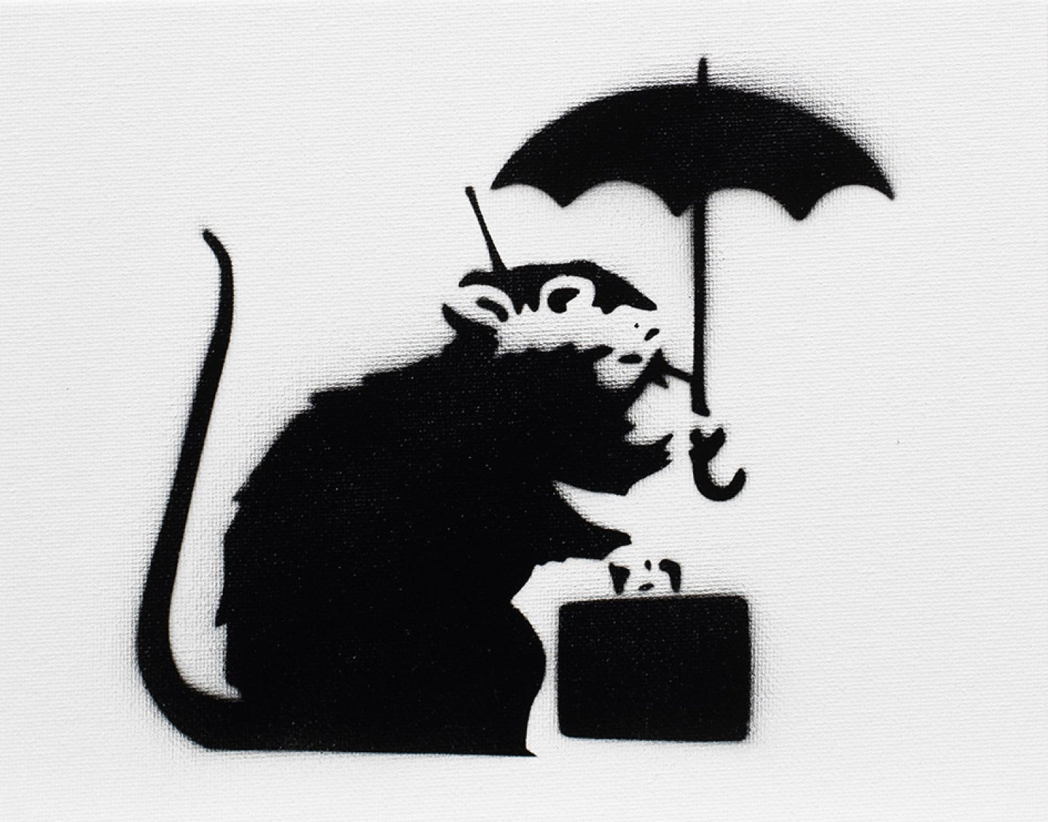 Pochoir (Schablonengraffiti)/Leinwandkarton, 2015. Souvenir der Kunstaktion Dismaland, die der Streetart-Künstler Banksy 2015 in Weston-super-Mare in England durchführte. In einer ehemaligen Badeanstalt errichtete er einen Vergnügungspark, der ausdrücklich nicht für Kinder geeignet war. Unter dem Namen "Dismaland" (deutsch Trostlosland) entwarf er ein Gegenprogramm zu Disneyland. Die Aktion war auf 36 Tage begrenzt, während derer eine Reihe verschiedener Souvenir-Multiples verkauft wurden. Verso mit Etikett "Dismaland. Bemusement Park / A Banksy Event". 20 cm x 25 cm.