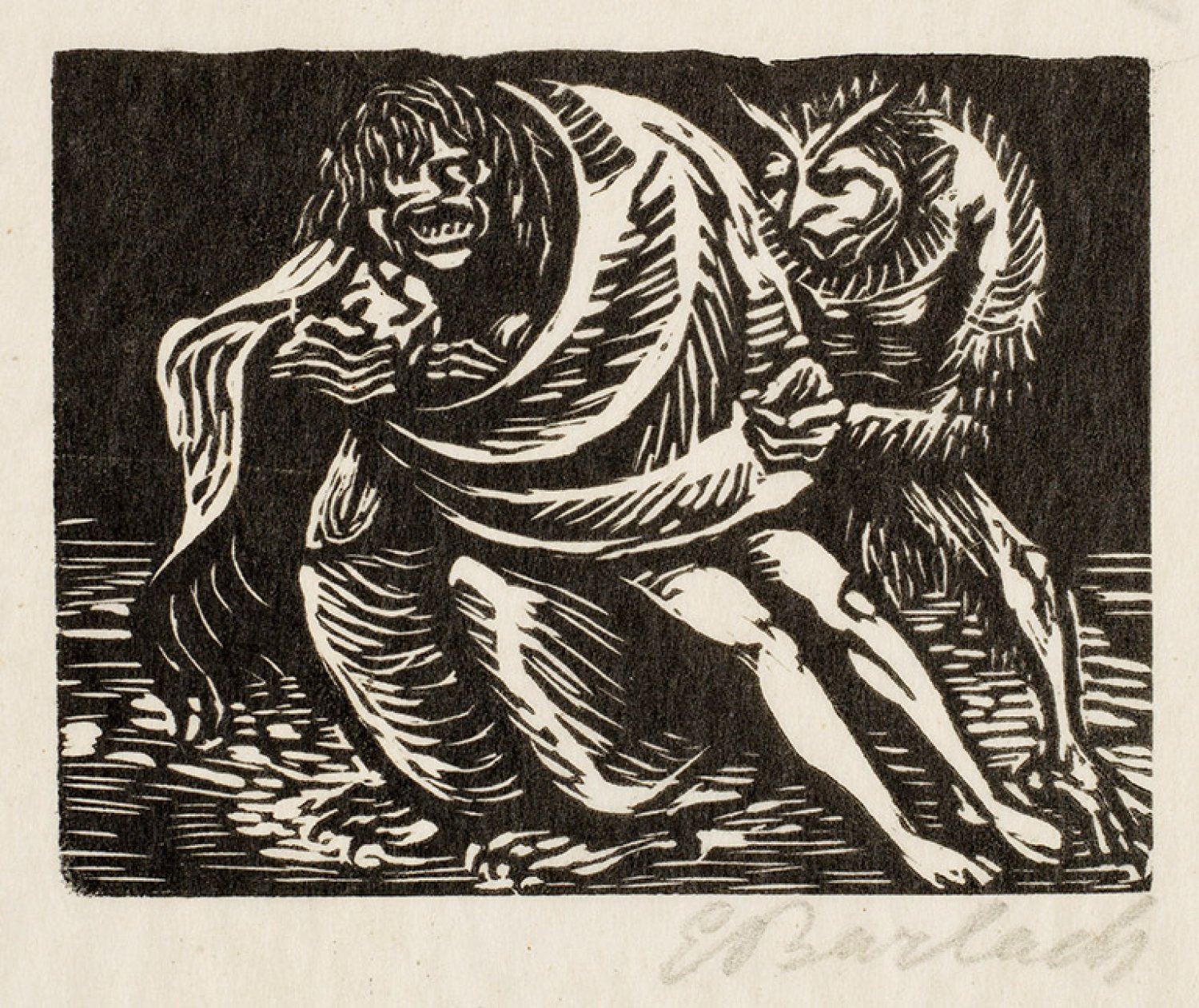 Holzschnitt/Papier, um 1920-1922. Illustration aus dem Buch "Goethe Walpurgisnacht" mit 20 Holzschnitten von Ernst Barlach, erschienen bei Paul Cassirer, Berlin 1923. R. u. sign.; Darstellung 7,6 cm x 10 cm (Passepartout), Blatt 12,5 cm x 19 cm.