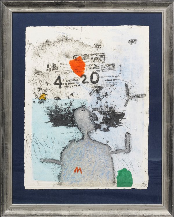 Komposition mit männlicher Figur, Ziffern und Textfragmenten