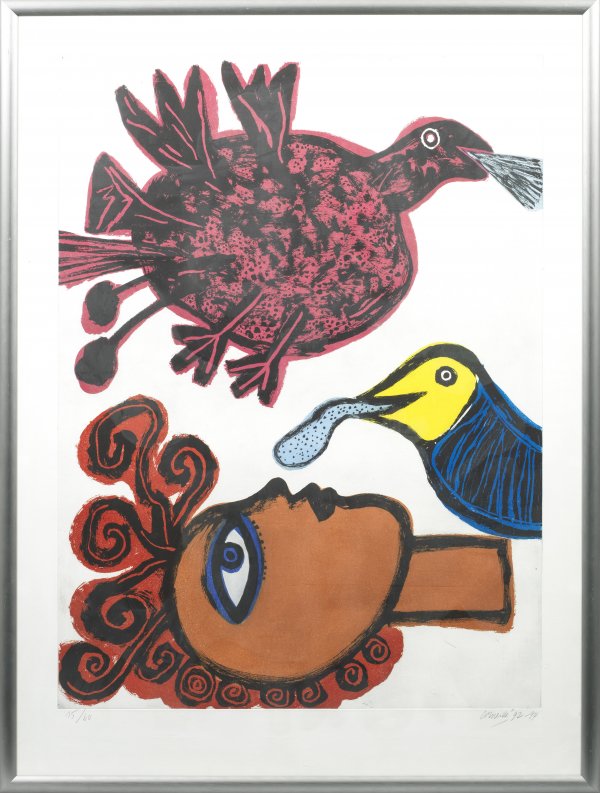 Farbradierung und -aquatinta/Papier, 1992/94. Sign., nummeriert 15/60 u. dat.; Großformatige Grafik des Künstlers, der mit Pierre Alechinsky, Karel Appel und K. O. Götz zur legendären, 1948-1951 bestehenden Avantgarde-Künstlergruppe "CoBrA" gehörte. Plattenmaß ca. 119,5 cm x 88,5 cm; Blatt ca. 140 cm x 105 cm. Rahmen.