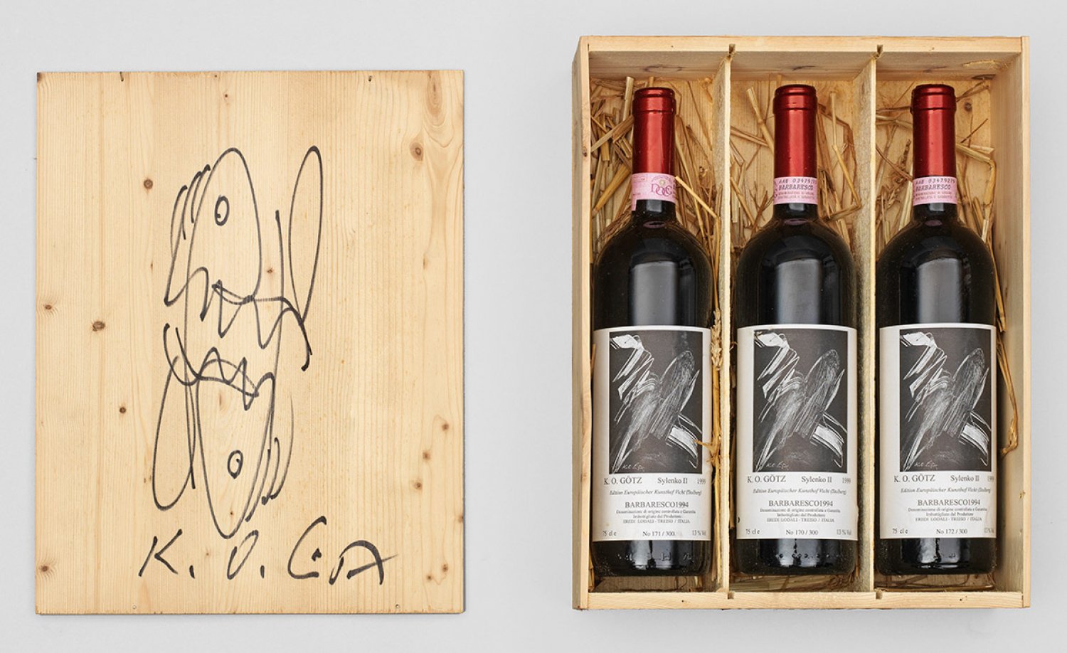 Holzkiste mit drei Rotweinflaschen. Auf dem Deckel mit einer signierten Originalzeichnung versehen. Künstlerweinlabel: K. O. Götz Sylenko II 1999. Edition Europäischer Kunsthof Vicht (Stolberg) BARBARESCO 1994 Eredi Lodali - Treiso Italia 75cl. Aus einer Auflage von 300 hier Flaschennummerierung 170 171 172. H. 10 cm. 36 cm x 20 cm.