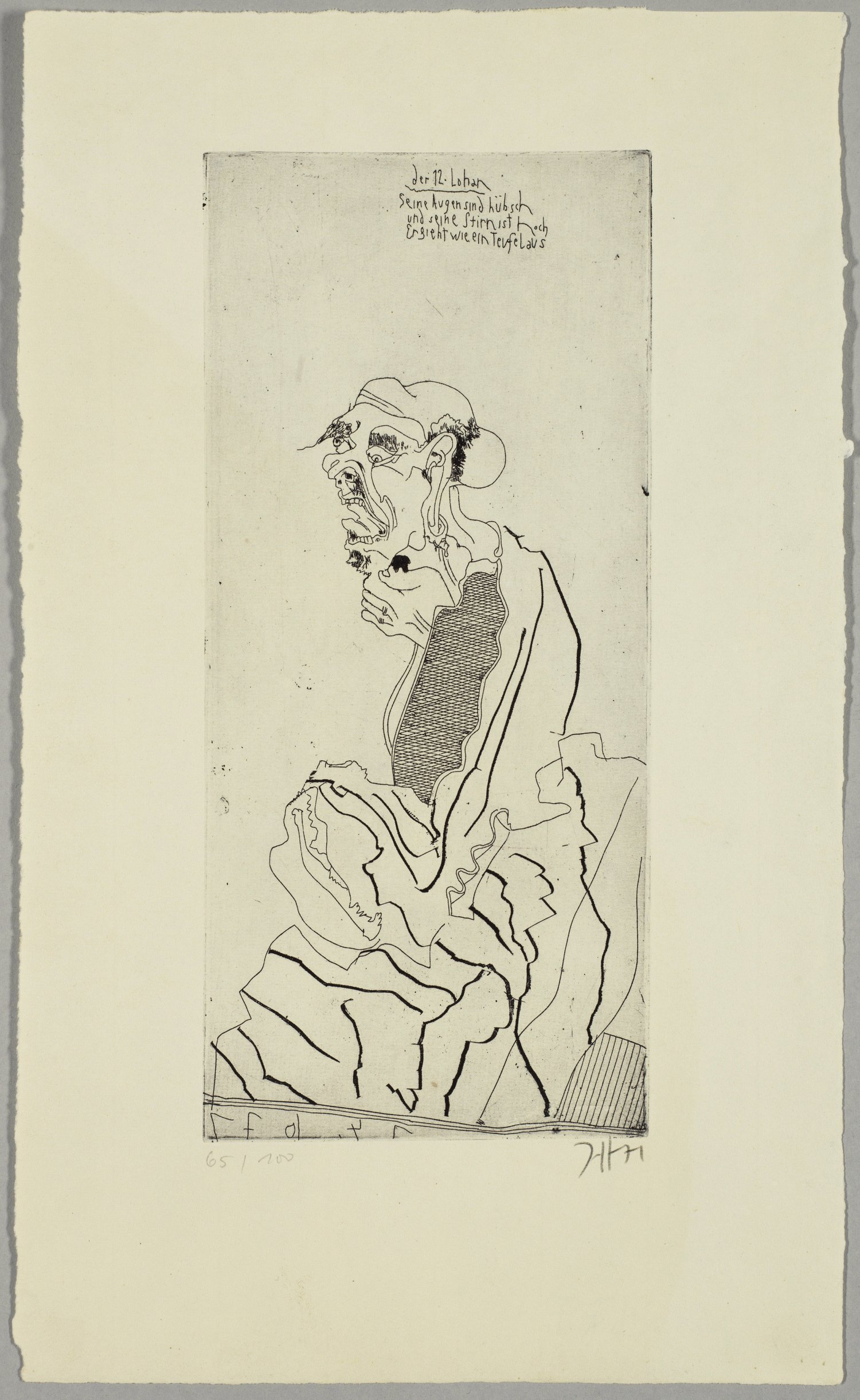 Radierung u. Aquatinta/chamoisfarbenes Papier, 1971. Sign., dat. u. nummeriert 65/100.; In der Platte betitelt u. bez. "Der 12. Lohan. Seine Augen sind hübsch und seine Stirn ist hoch (/) Er sieht wie der Teufel aus". Wvz. Frielinghaus 71/72. Plattenmaß ca. 29,7 cm x 13,5 cm; Blatt ca. 41 cm x 25 cm.