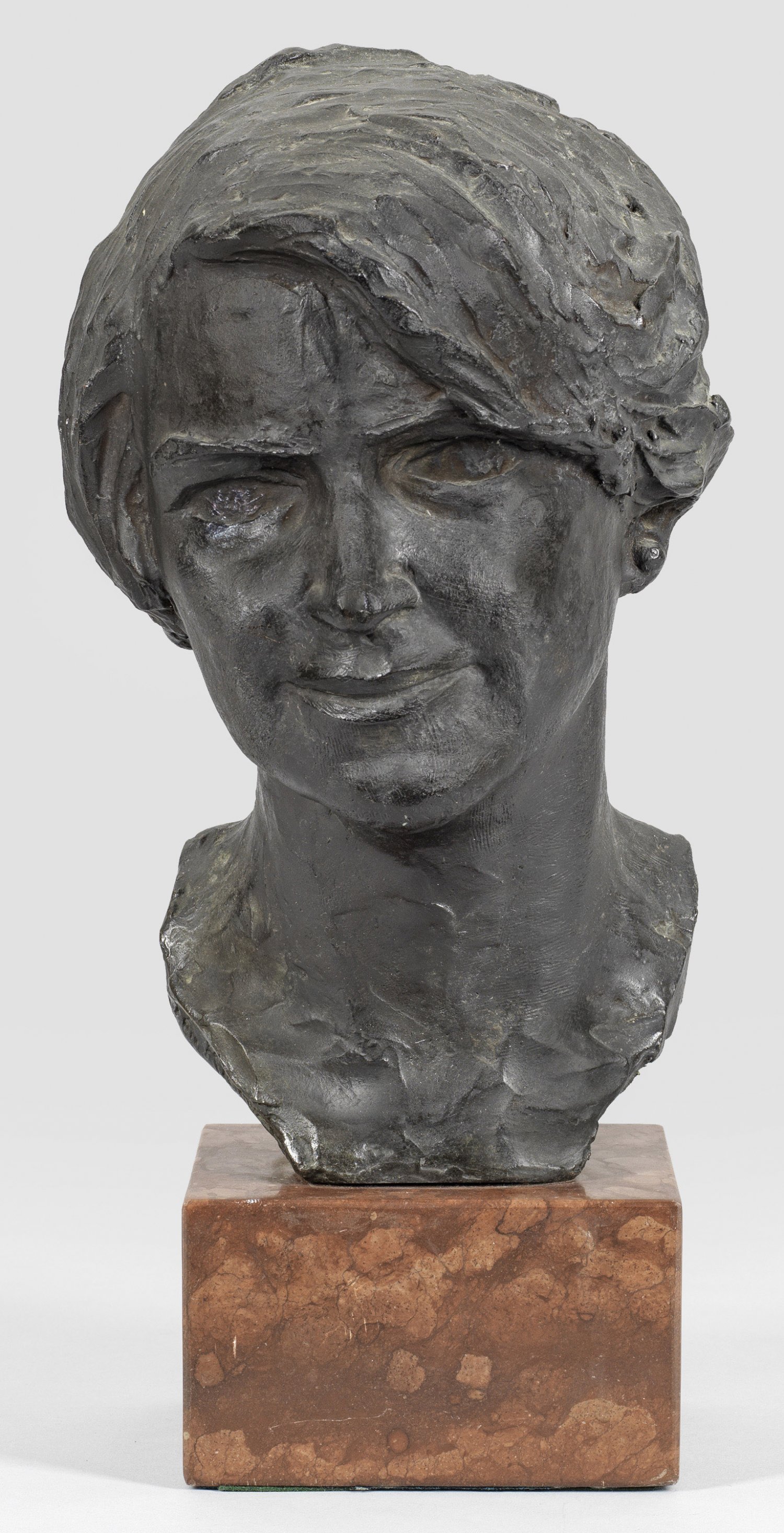 Bronze, dunkel patiniert. Sign. u. betitelt. Rote Marmorplinthe. Barbara von Kalckreuth studierte in den 1930er Jahren in den USA beim amerikanischen Bildhauer Jerome Fristt, einem Meisterschüler Rodins. Nach ihrer Rückkehr beteiligte sie sich 1938-1943 an der Großen Deutschen Kunstausstellung in München. Ihr Schaffensschwerpunkt waren Porträtbüsten, u. a. von Gustav Stresemann, Felix Graf Luckner, Max Schmeling, Luis Trenker und Ehrenfried Günther Freiherr von Hünefeld. Ges.-H. 42 cm.