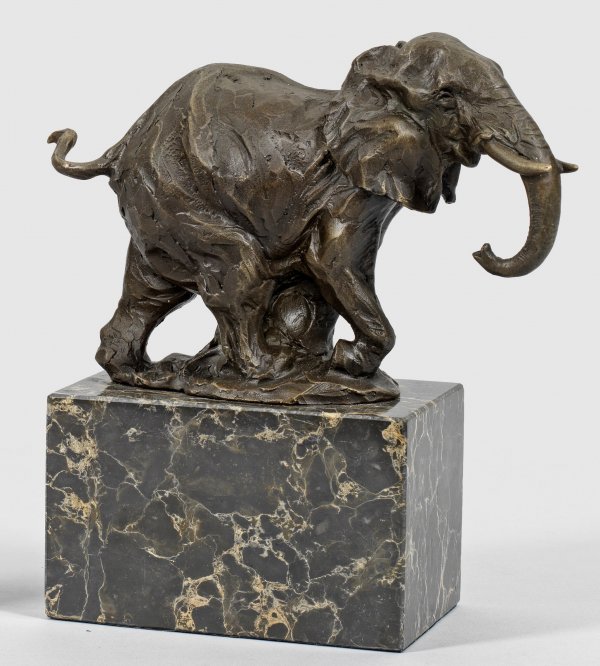 Bronze, braun patiniert. Sign. "Milo". Dunkelgrauer, hell marmorierter Steinsockel. Ges.-H. 20,5 cm.