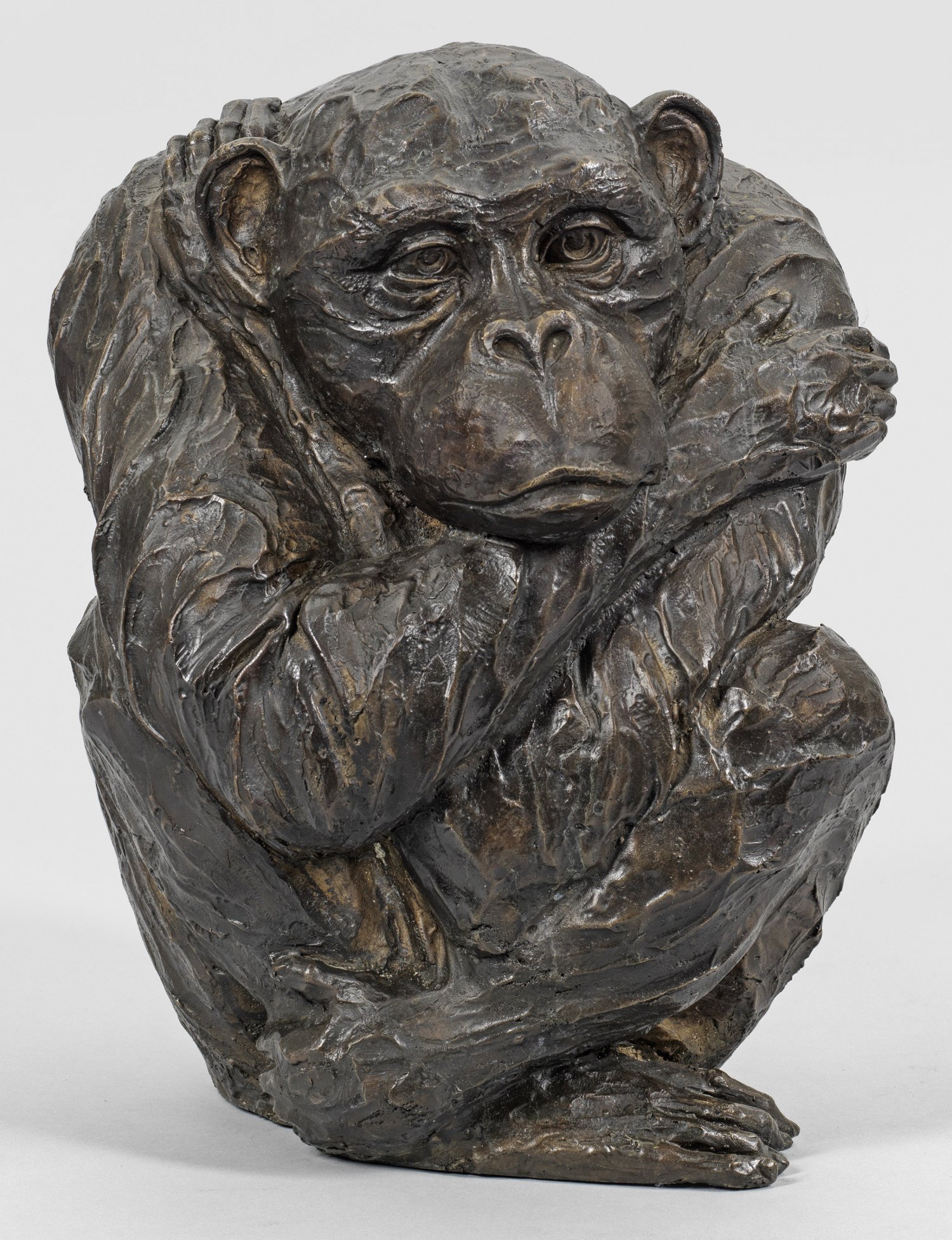 Bronze, dunkel patiniert. Vollplastische, in moderner Weise stilisierte, von Rembrandt Bugatti und Jean Baptiste Vendamme beeinflusste, das Wesen des Tieres zum Ausdruck bringende Darstellung eines zusammengekauert sitzenden Schimpansen, der den Kopf nachdenklich gestimmt auf seinen rechten Unterarm stützt. H. 43 cm.