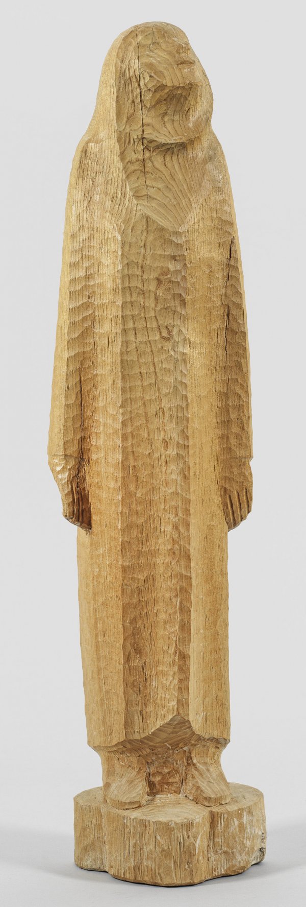 Eichenholz, geschnitzt, rücks. abgeflacht. Sign.; Große, blockhaft stilisierte, expressionistische, von Barlach inspirierte Skulptur mit der Darstellung einer stehenden, jungen Frau in langem, umhüllendem Gewand, die zum Himmel aufschaut. H. 100,5 cm.