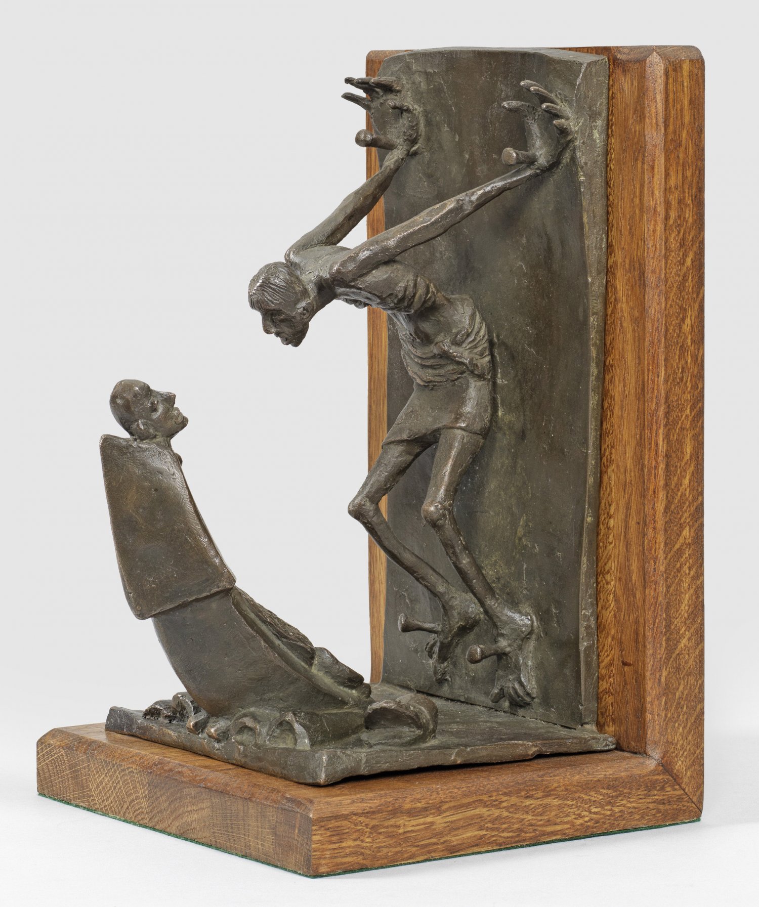 Bronze, dunkelbraun patiniert; Eichenholz. In seiner Expressivität kaum mehr steigerbar ist die dürre Gestalt Christi mit großen Nägeln an einer Wand fixiert, der Oberkörper und der Kopf vornüber gebeugt, die Hände krallenartig und um 180 Grad widernatürlich gedreht. Vor ihm kniet ein Bischof in demütiger Pose mit abgelegter Mitra. Kleinhans, der an der Werkkunstschule Münster bei Kurt Schwippert und an der Akademie in München bei Heinrich Kirchner studierte, war ein umfassend künstlerisch und handwerklich ausgebildeter Bildhauer, der seine Bronzeplastiken selbst goss und bearbeitete. Thematisch widmete er sich besonders biblischen, religiösen und mythologischen Motiven, die er für den kirchlichen bzw. öffentlichen Raum in Nordrhein-Westfalen und ganz Deutschland schuf. 30,5 cm x 20 cm x 18,5 cm.