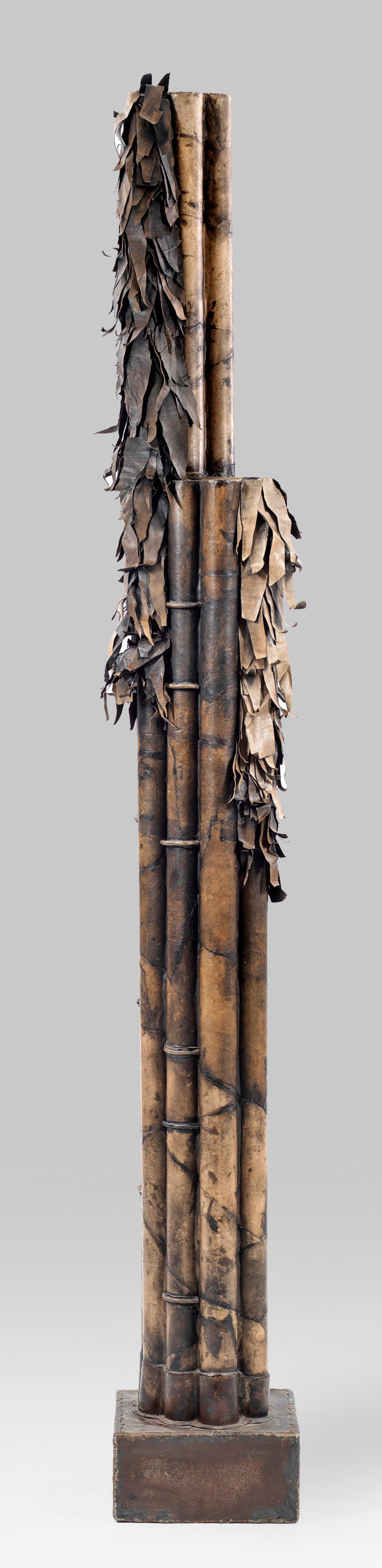 Objekt-Skulptur aus Karton-Rollen und teilw. gerissenem Leder auf Metallsockel. Wvz. 956. Großformatige Arbeit des Grenzgängers zwischen den Kunstgattungen. Einen Schwerpunkt seines Oeuvres bilden zwei- und dreidimensionale Lederobjekte, wobei er das häufig zweitverwendete Leder oft mit Holz, Metall, Textilien und anderen Materialien kombinierte. Kalinowski studierte 1945-1948 zunächst an der Kunstakademie in Düsseldorf und von 1950-1952 in Paris an der Académie de la Grande Chaumičre im "Atelier d’art abstrait" von Jean Dewasne. Abstraktion und Materialität prägten seitdem sein Oeuvre. Ab Mitte der 1950er Jahre entstanden erste abstrakte Collagen, Materialbilder und mit Leder bespannte Objektkästen. Solche erstmals 1958 in der Avantgarde-Galerie von Daniel Cordier in Paris gezeigte Arbeiten stießen allerdings auf ebenso wenig Verständnis wie einige Jahre später Arman und die Gruppe des Nouveau Réalisme. 1968-1989 lehrte Kalinowski an der Akademie in Karlsruhe, ab 1972 als Professor; 1983 arbeitete er als Ehrengast an der Deutschen Akademie Rom Villa Massimo. H. 225 cm.