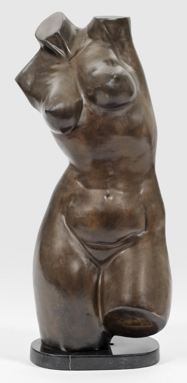 Bronze dunkelbraun patiniert. Schwarze Marmorplinthe. Große moderne Bronzeplastik des auf weibliche Aktfiguren Torsi und Tänzerinnen spezialisierten Bildhauers. Durch sorgfältig geglättete häufig polierte Oberflächen betonte er die haptischen erotisierenden Reize bzw. rief ein lebendiges Licht- und Schattenspiel hervor. H. 63 5 cm. Minim. Altersspuren.