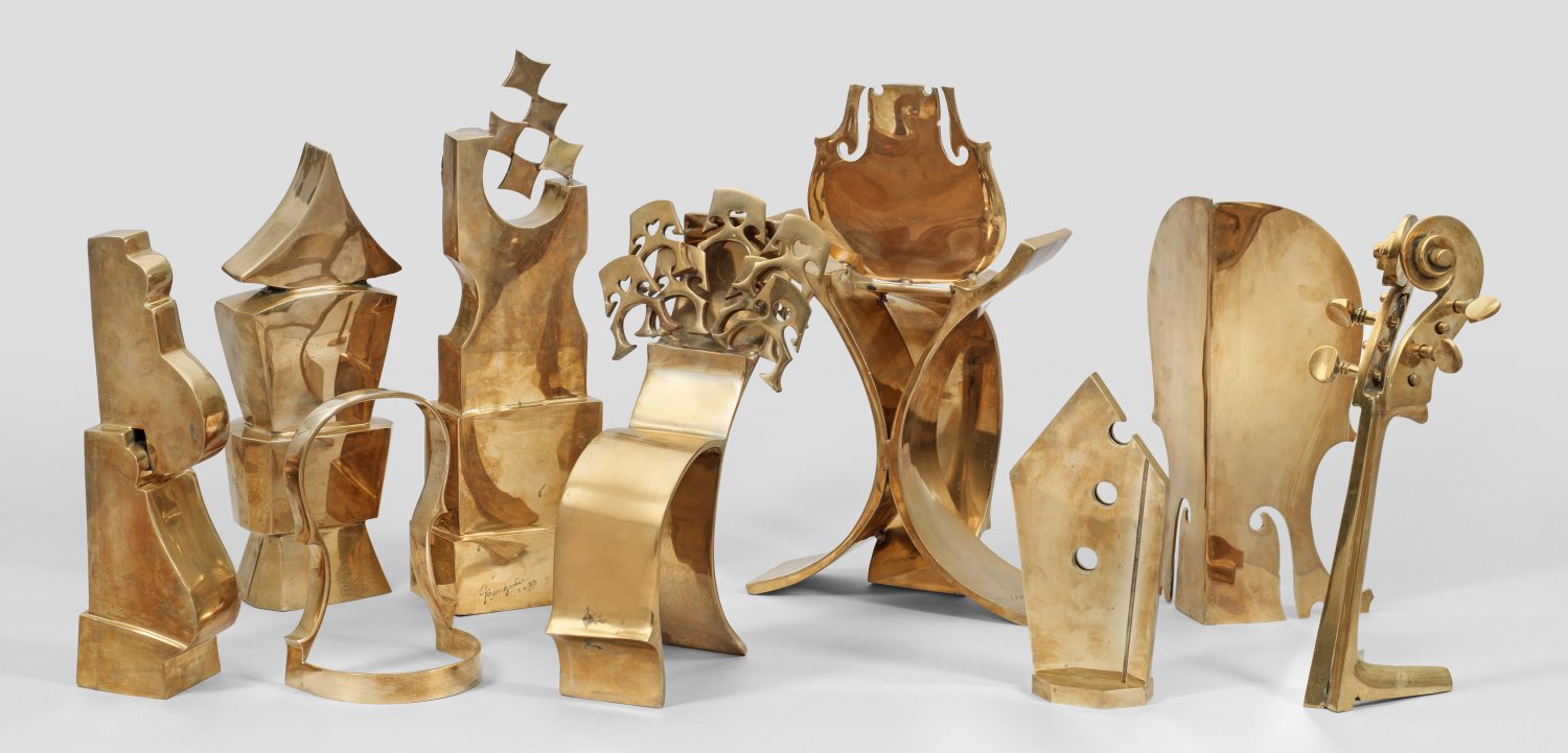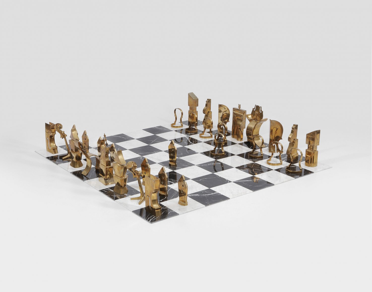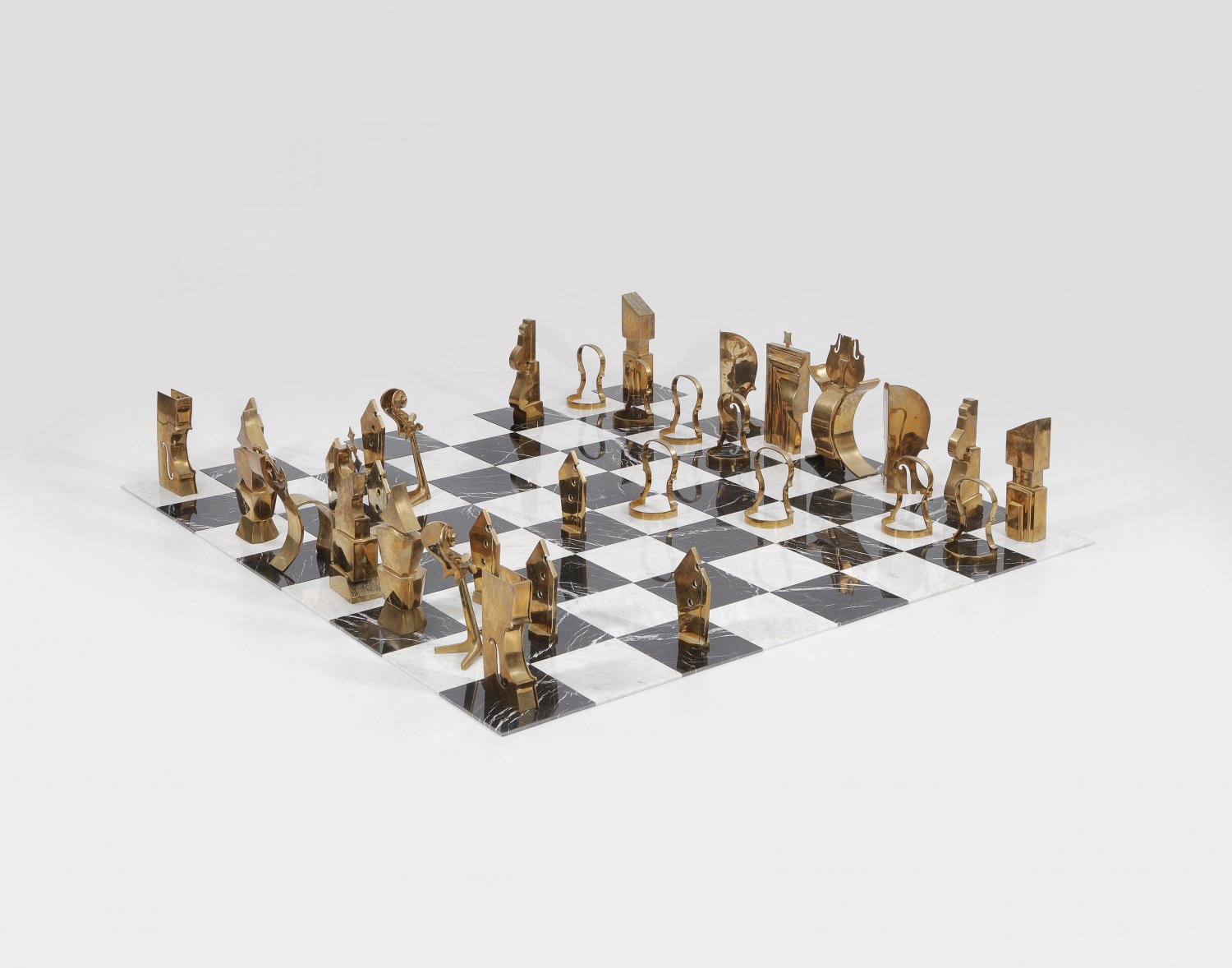 Bronze, Schachbrett aus weißen und schwarzen Marmorfliesen. Entw. Arman und George Boisgontier, 1986. Limitierte Auflage von 5 Exemplaren plus 2 "EA"-Exemplaren. Beim vorliegenden Lot handelt es sich um "EA 1/2". Außer dieser monumentalen Version gab es eine kleine Ausführung in einer Auflage von 75 Exemplaren. Dieses Schachspiel wurde in künstlerischer Zusammenarbeit zwischen dem französisch-amerikanischen Objektkünstler und Mitbegründer des Nouveau Realisme - Arman - und dem französischen Bildhauer George Boisgontier gemeinsam geschaffen. Jeder der Künstler gestaltete jeweils 16 Figuren, die in unterschiedlich kubistisch abstrahierter bzw. surrealistischer Weise stilisierte Streichinstrumente darstellen. In Armans Figuren drückt sich seine Leidenschaft für sinnliche, weibliche Formen der Streichinstrumente aus, die ab den 60er Jahren ein zentrales Motiv seines Oeuvres waren, indem er Violinen und Kontrabässe häufig zertrümmerte, verbrannte und zersägte. Dagegen verwandeln sich Boisgontiers, straff abstrahierte Figuren durch ihre archaischen, geometrischen Formen, gleichsam in moderne Idole voller Symbolik. Für die Künstler ist das Schachspiel zugleich eine Allegorie des Lebens: Als von der Natur und seinen eigenen widersprüchlichen Gefühlen beherrschte Figur steht der Mensch ständig unter Kontrolle. Werke von Arman, der 1964, 1968 und 1977 auf den Documenta-Ausstellungen in Kassel vertreten war, befinden sich im u. a. im MoMA in New York, im Hirshhorn Museum in Washington und in der Tate Gallery in London. Schachbrett ca. 244 cm x 244 cm; Figuren H. ca. 26 cm-52 cm, B. ca. 19 cm-21 cm, T. ca. 10 cm-28 cm.