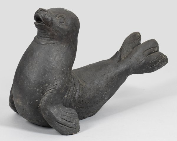 Keramik, dunkelbraunschwarz engobiert. Vollplastische, in moderner Weise stilisierte Figur einer jungen Robbe. Monogr. "LH". H. 31 cm.