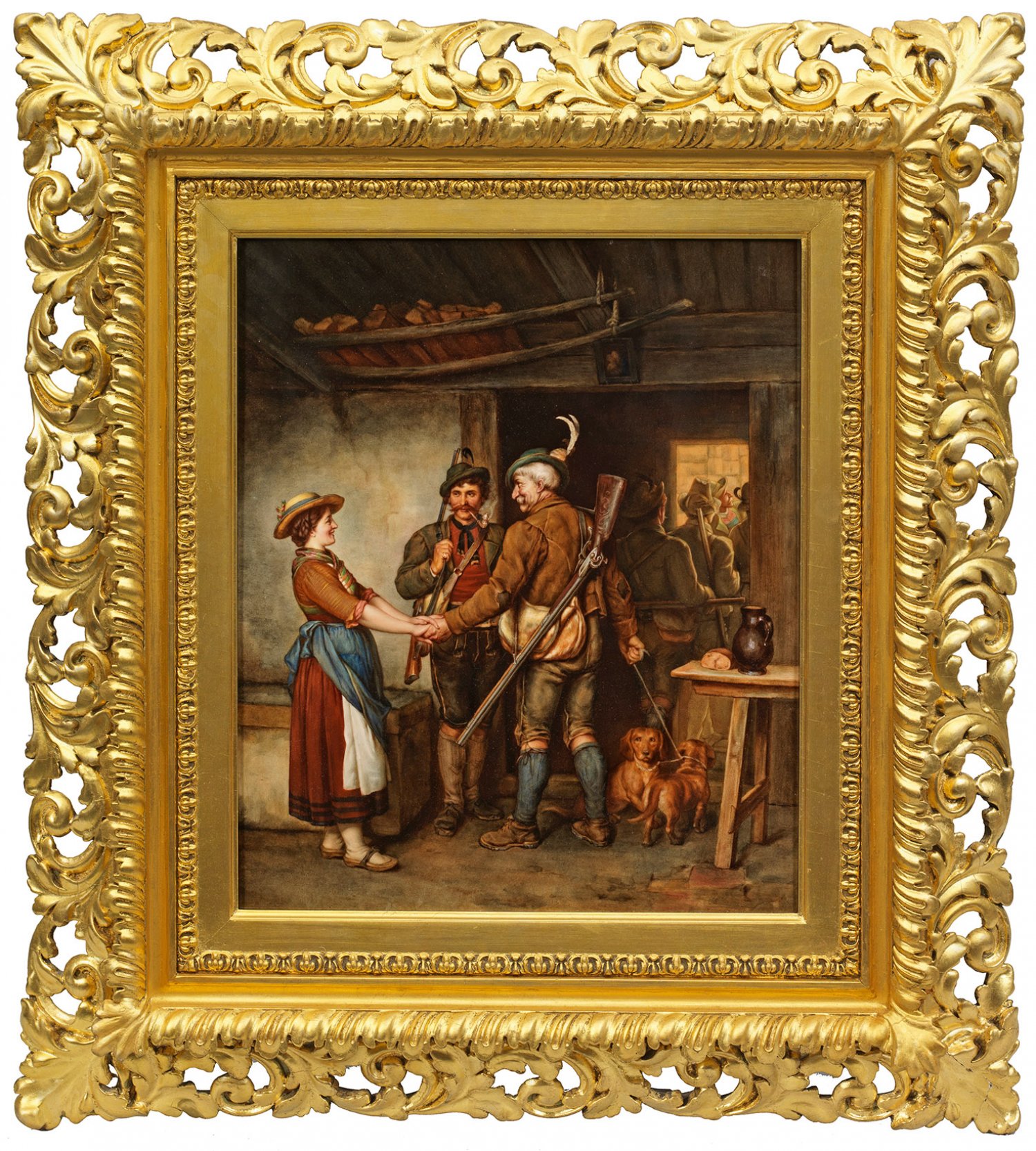 Rechteckige Bildplatte mit szenischer Darstellung einer Jagdgesellschaft in bäuerlichem Wirtshausinterieur beim Abschied der Jäger von der Sennerin. Äußerst feine polychrome Malerei nach einem Gemälde von Franz von Defregger (1835 - 1921). Von großen, durchbrochen gearbeiteten Blattvoluten umzogener, vergoldeter Stuckrahmen mit Ornamentleisten. Eingeritzte Nr. 118 C. Schwertermarke. Rahmen rest.; Platte 45 cm x 38 cm. 72 cm x 66 cm. Rahmen.
