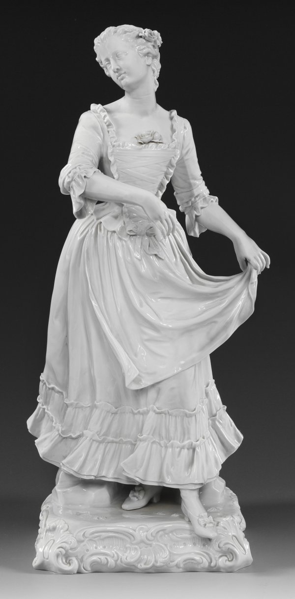 Große Figur einer Tänzerin Weißporzellan. Auf stark reliefiertem, quadratischem Rocaillesockel in Tanzpose mit vorgestrecktem linken Fuß stehendes Mädchen in sommerlicher Kleidung. Entw. Ernst August Leuteritz, um 1853. Modell-Nr. 73311. Best.; Haarriss. Schwertermarke. H. 46 cm.