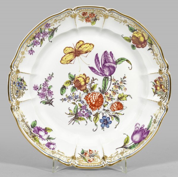 A porcelain serving plate with decor "Cumberland", painted with flower arrangements after J. Zächenberger. Minor burn mark. Manufacturer's mark.