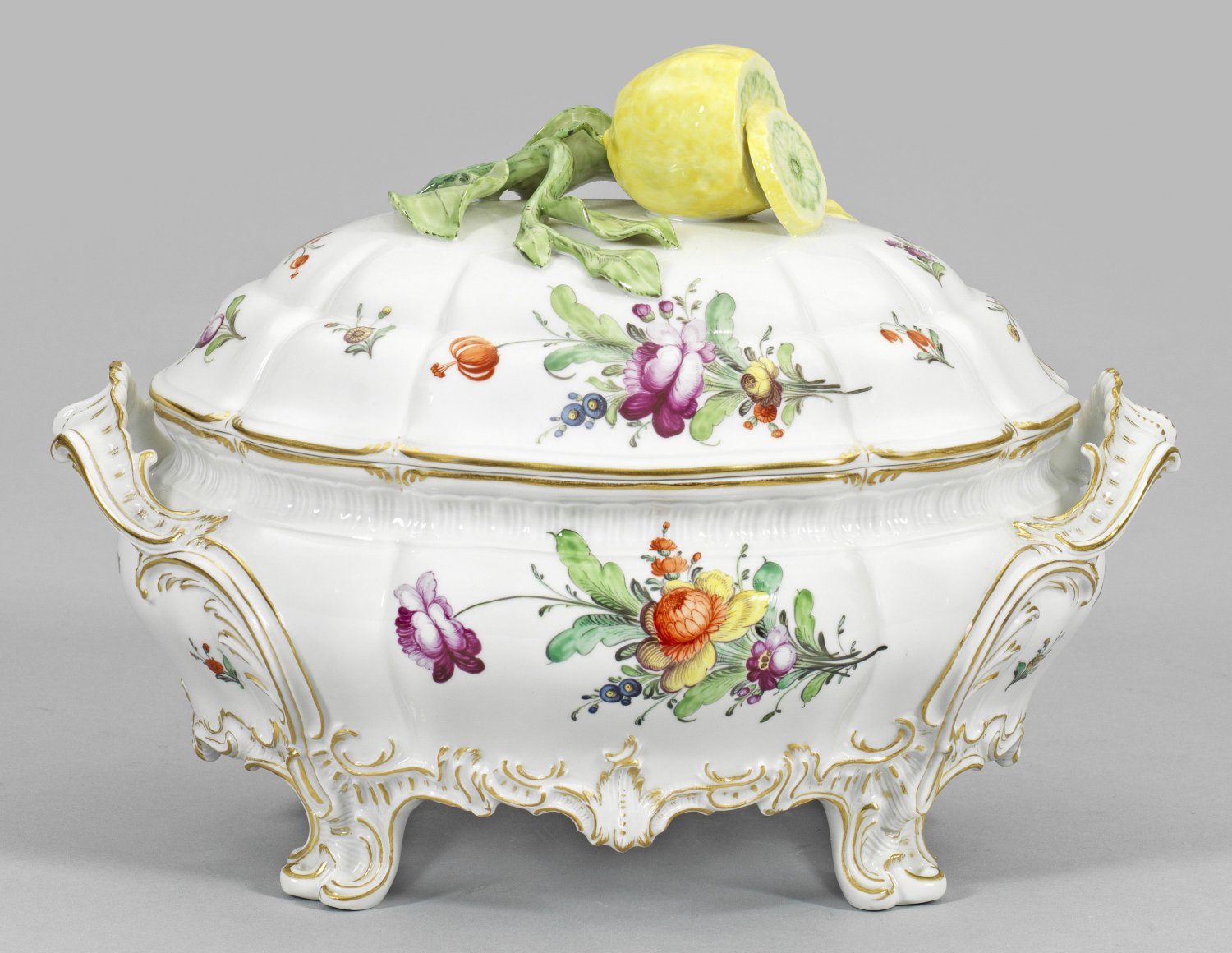 Prächtige Deckelterrine mit Dekor "Nymphenburger Bukett" Über vier Volutenfüßen ovaler, gedrückt bauchiger Korpus mit mehrfacher Godronierung, umzogen von rocailleförmigem, goldstaffiertem Reliefdekor. Passig geschweifter Rand und seitliche Blattvolutenhenkel. Getreppter, aufgewölbter Deckel mit plastischem Knauf in Gestalt einer angeschnittenen Zitrone. Form "Rokoko", ursprünglich für das "Churfürstliche Hofservice". Auf der Wandung und dem Deckel farbenprächtige Blumenbuketts, umgeben von vereinzelten, gestreuten Blumen und Blütenzweigen in äußerst feiner, polychromer Malerei. Manufakturmarke. H. 22 cm. 32 cm x 22 cm.