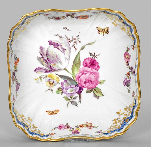 Prächtige Anbietschale "Breslauer Stadtschloss" Quadratische, tief gemuldete Form. Reliefdekor "Rocaille". Im Spiegel farbenprächtiges Blumenbukett, umgeben von Schmetterlingen, auf Innen- und Außenwandung Blumenfestone und feine, von reliefiertem Rankenwerk umzogene, blaue Schuppenmosaikfonds. Polychrome Malerei mit reicher Goldstaffage. Zepter- und Malereimarke. 23 cm x 23 cm.