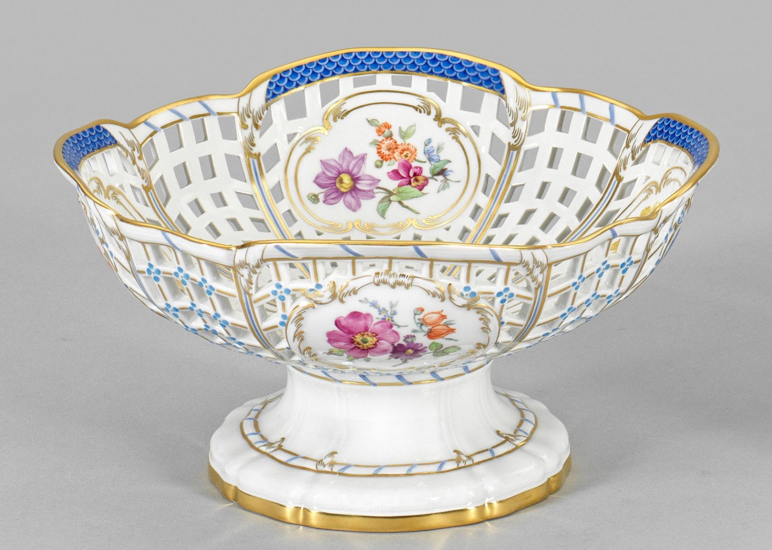 Prächtige Aufsatzschale "Breslauer Stadtschloss" Annähernd quadratische Form auf eingezogenem Rundfuß mit gitterartig durchbrochen gearbeiteter Wandung, in den Schnittstellen reliefiert mit kleinen Vergissmeinnichtblüten. In großen Rocaillekartuschen farbenprächtige Blumenbuketts sowie feine, von Rankenwerk umzogene, blaue Schuppenmosaikfonds an der Randzone. Polychrome Malerei mit reicher Goldstaffage. Zepter- und Malereimarke. H. 10,5 cm. 19 cm x 19 cm.