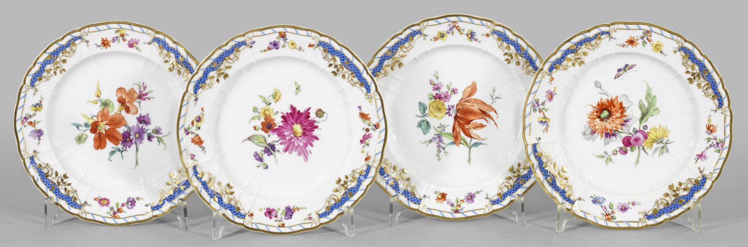 Vier Vorspeisenteller "Breslauer Stadtschloss" Reliefdekor "Rocaille". Im leicht vertieften Spiegel farbenprächtiges Blumenbukett, teilw. mit Schmetterlingen. Auf der Fahne Blumenfestone und feine, von reliefiertem Rankenwerk umzogene, blaue Schuppenmosaikfonds. Polychrome Malerei mit reicher Goldstaffage. Zepter- und Malereimarke. D. 22 cm.