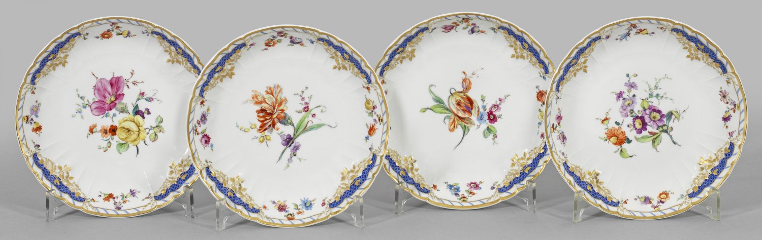 Vier Dessertschalen "Breslauer Stadtschloss" Runde, gemuldete Form. Reliefdekor "Rocaille". Im Spiegel farbenprächtiges Blumenbukett, auf der Fahne Blumenfestone und feine, von reliefiertem Rankenwerk umzogene, blaue Schuppenmosaikfonds. Polychrome Malerei mit reicher Goldstaffage. Zepter- und Malereimarke. D. 20 cm.