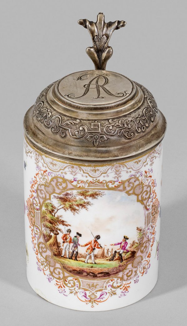 Walzenkrug mit Soldatenszene Zylindrischer Korpus, rückseitig geschwungener Bandhenkel. Auf der Schauseite vierpassige, von Laub- und Bandelwerk gerahmte Reserve mit szenischer Darstellung von Soldaten mit Kriegsgefangenem in einem Heerlager, vor einem Hauptmann stehend. Seitlich farbige Blumenbuketts und gestreute Blüten. Polychrome Malerei in der Art Höroldts. Golddekor. Erg. aufgewölbter und gravierter Silberdeckel mit blattreliefiertem Drücker, Bandelmuster und "Augustus Rex"- Monogramm für August den Starken. Undeutl. gest.; Im Boden bez.; Minim. rest.; Gold ber.; Schwertermarke. H. 18 cm.